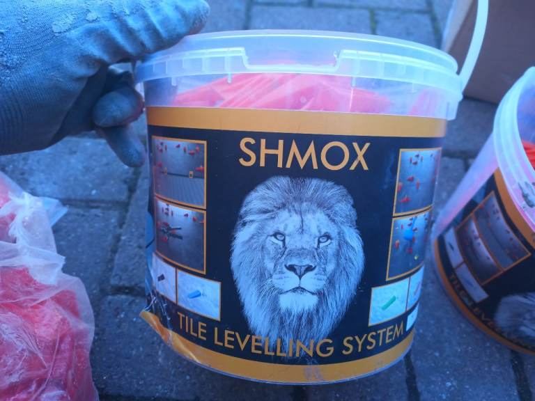 Shmox tile spacers with levelling wedges and pliers for setting.
