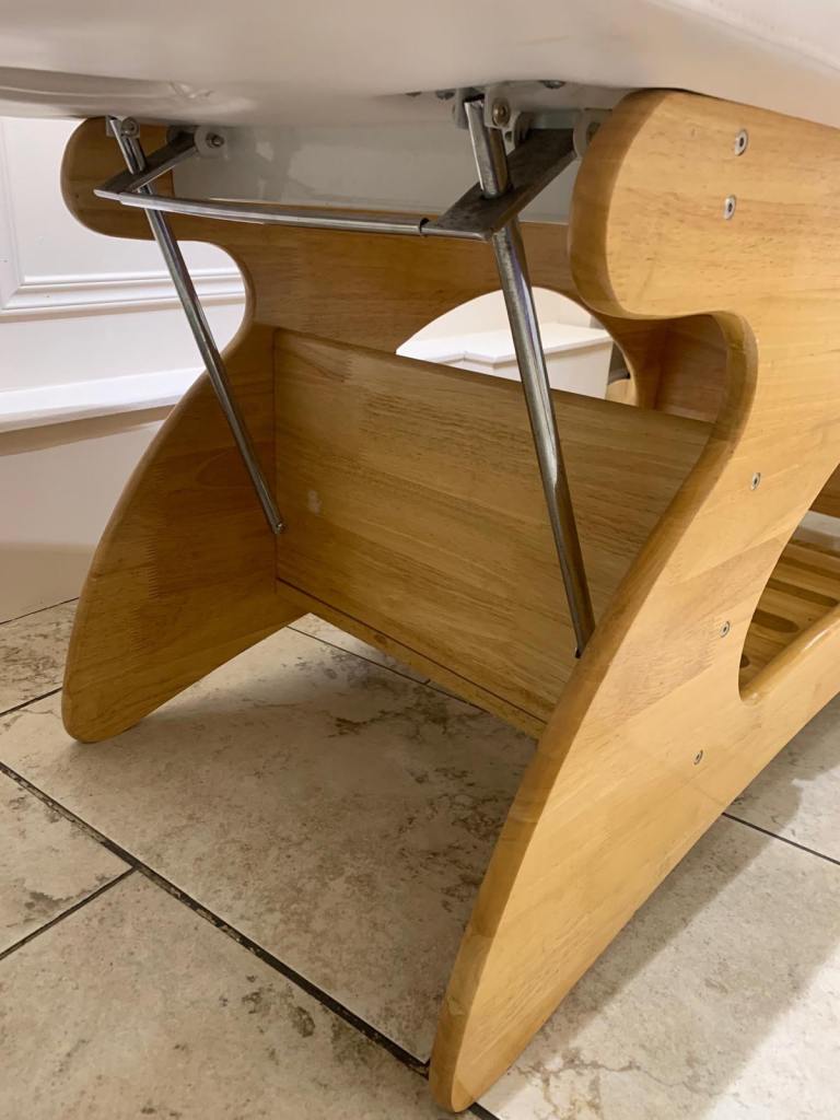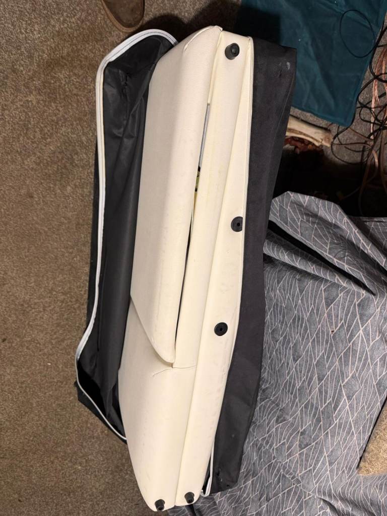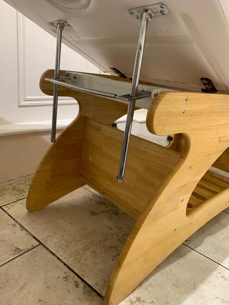 Spa massage couch. Storage underneath. Been used with a cover which has caused a slight discolouration, slight cracking around face hole, although this could be re-covered easily as head end detaches.