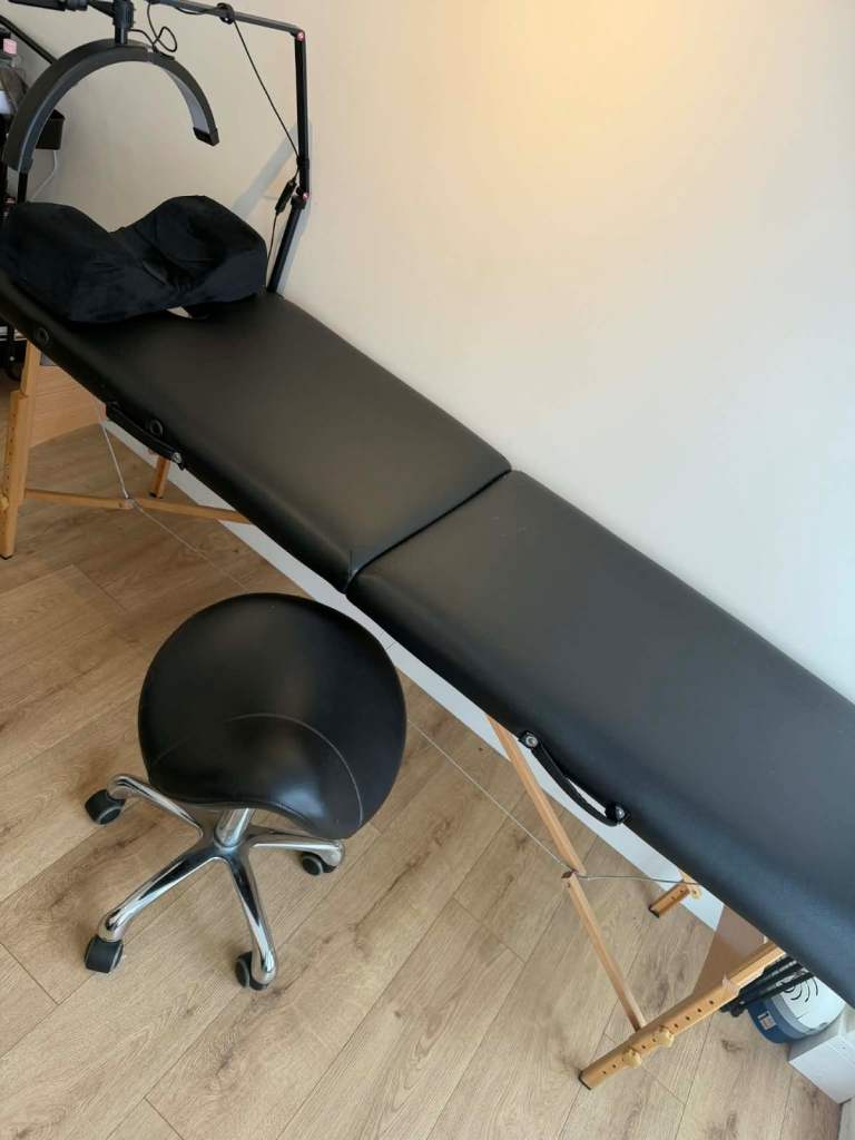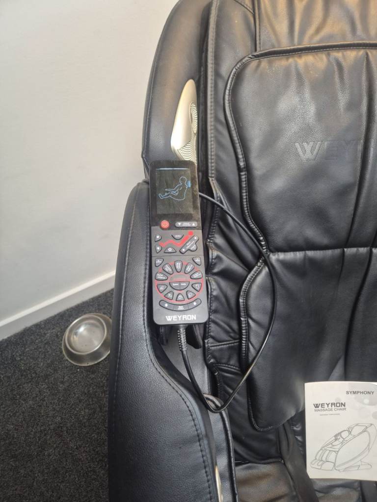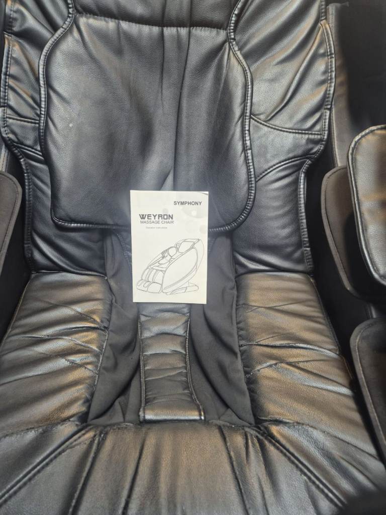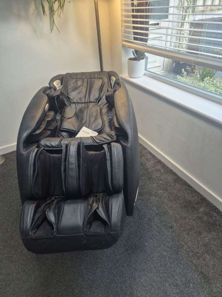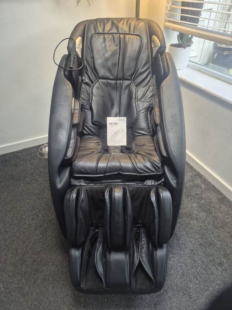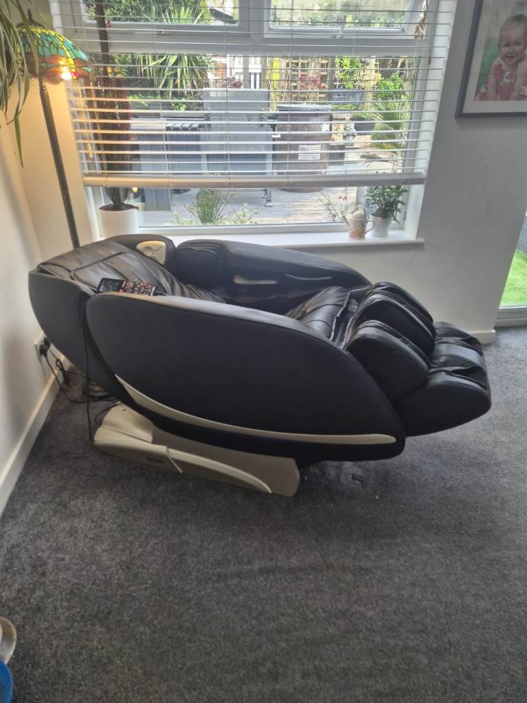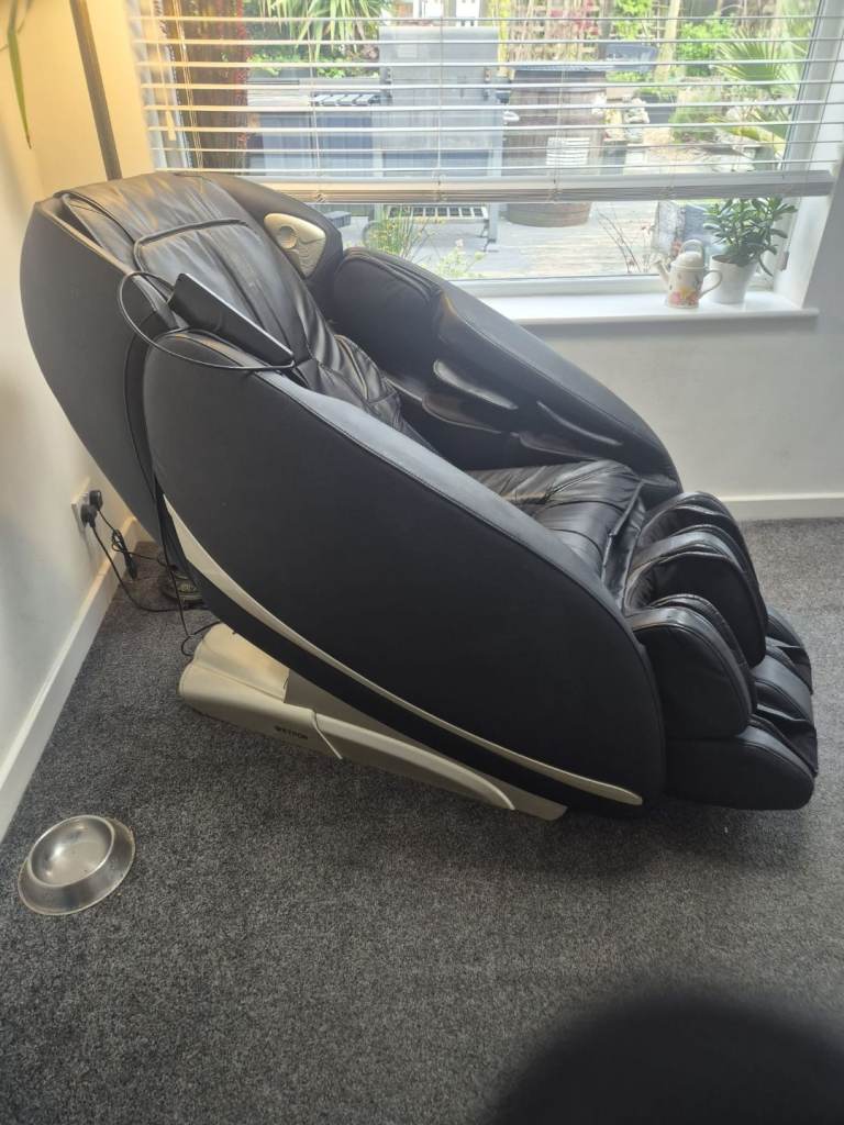 Black leather massage chair. Comes with manual. Age related makes, not ripped though. . Comes with Bluetooth built-in The strong rolling motions feels like a real humans massage. Increases blood circulation, eliminate fatigue and reduces stress. Need to sell due to moving and we have no where to put it. Please read the rest of information in the photos. Bought for £3,800 so getting a real bargain . Can deliver for fuel if local .