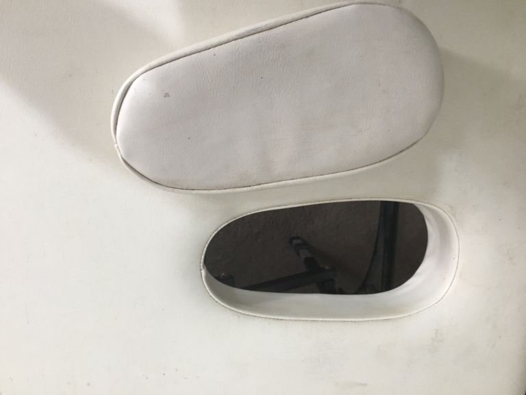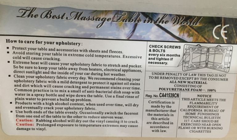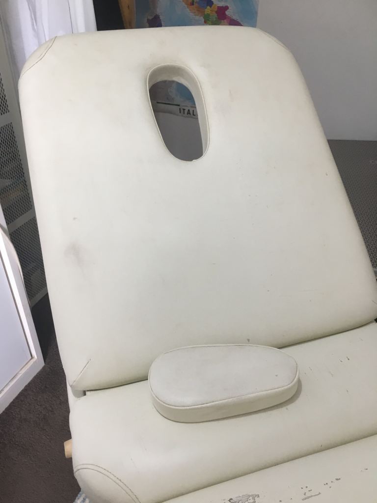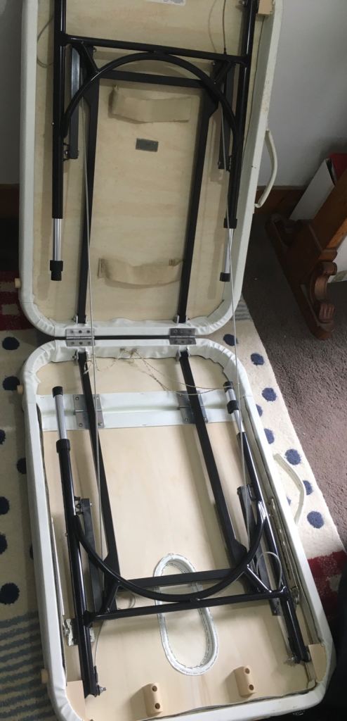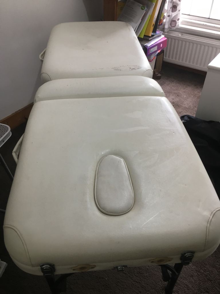 White , a bit scuffed from use , but perfectly solid and beautiful useful and solid table, and use with massage table covers . Comes with brilliant smart carrying bag ( tiny tear ) . Face hole , and upper body raiser . Very solid and stable . c. 60 cm width . Only parting with it because giving up my Rosen Method Bodywork Practitioner practice .