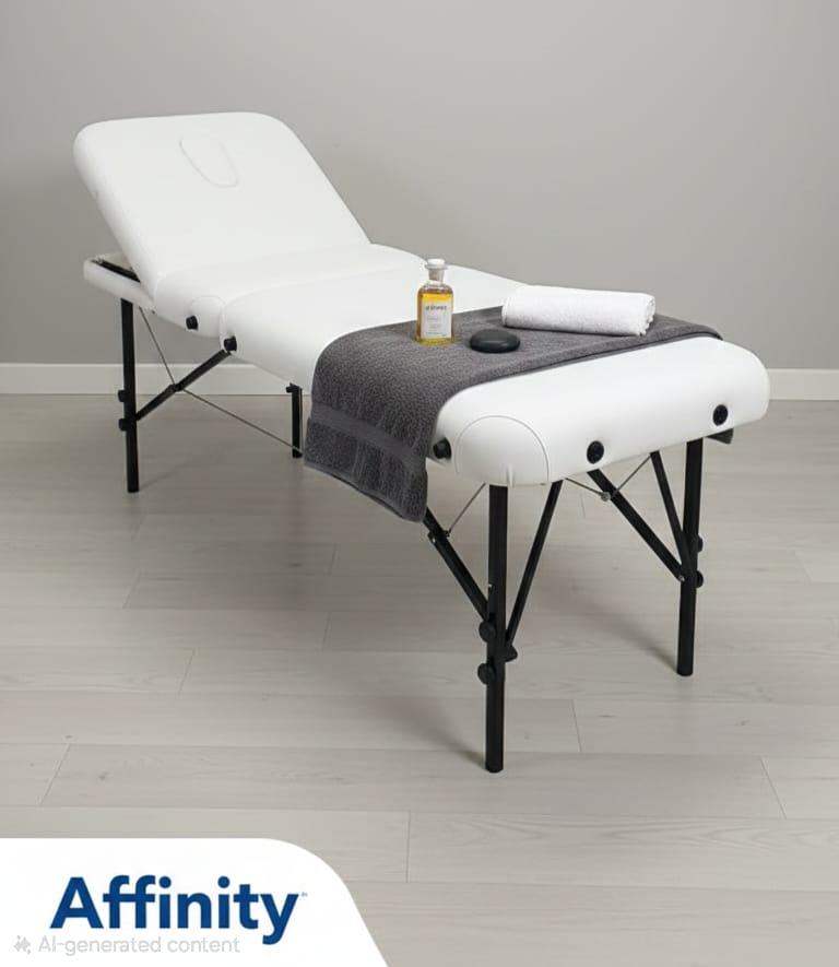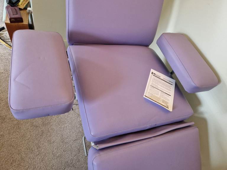 Buckingham BEC500-530 electric three-section adjustable treatment couch, with plush lilac antimicrobial vinyl upholstery.