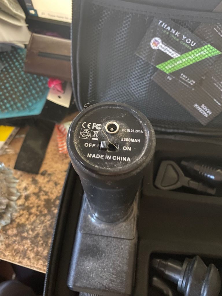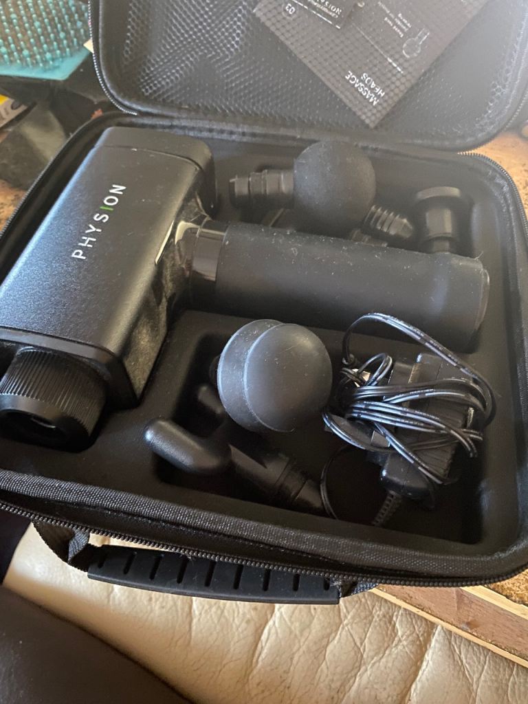 Physion PRO massage gun. This percussive therapy device is designed to relieve muscle pain and accelerate recovery.