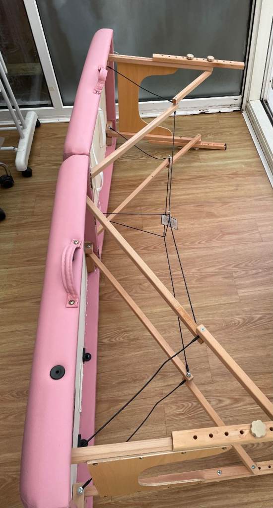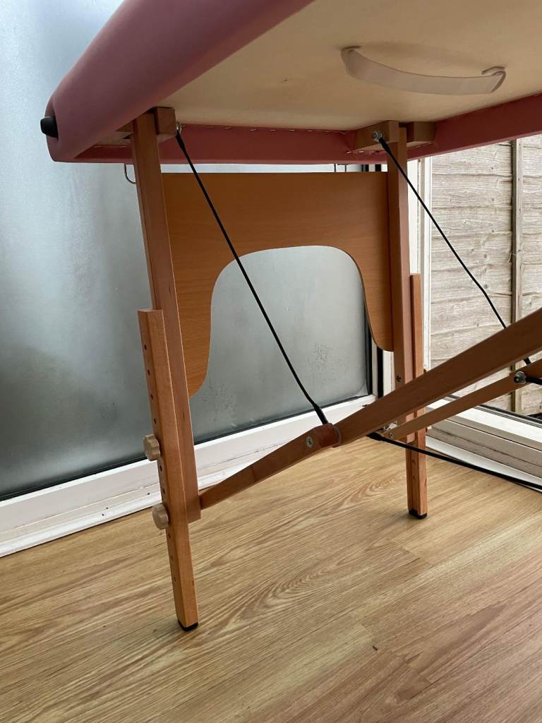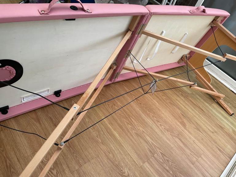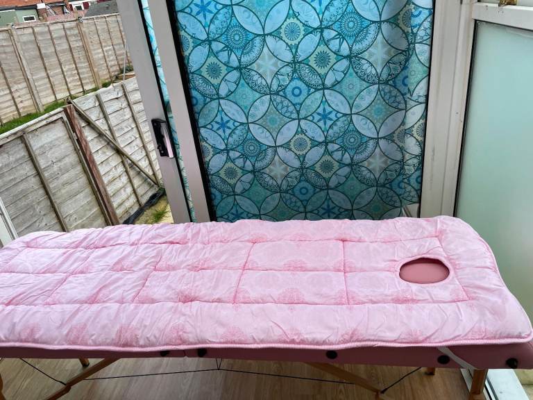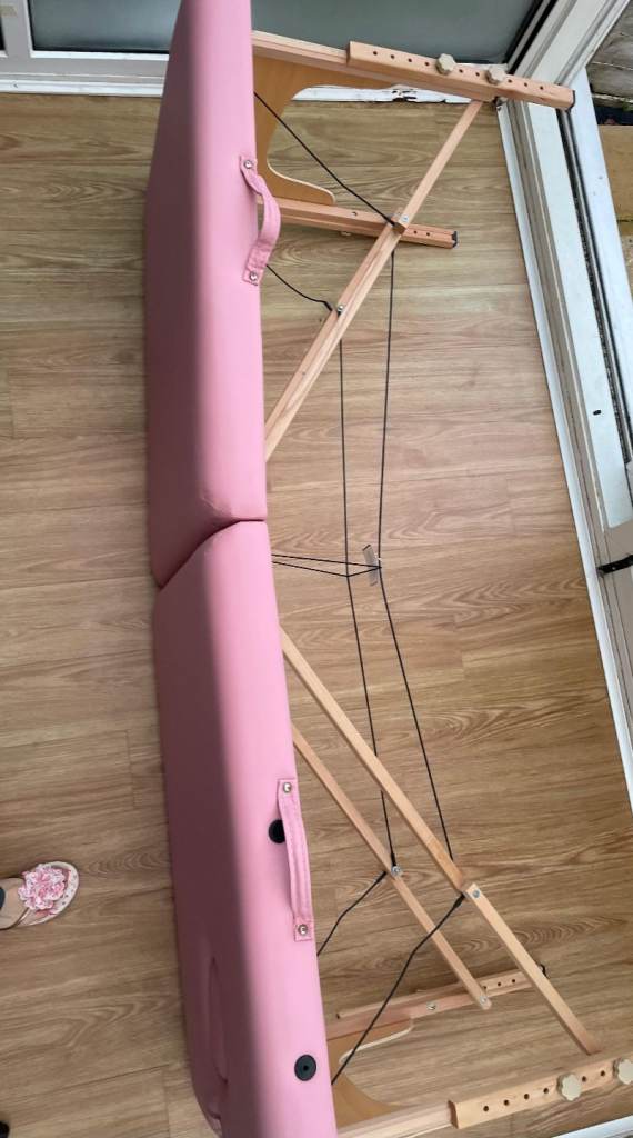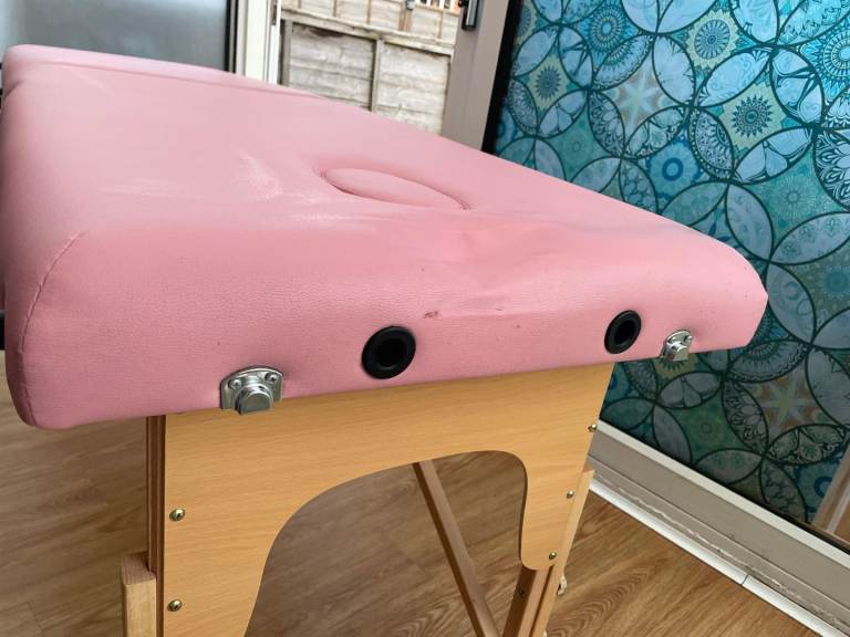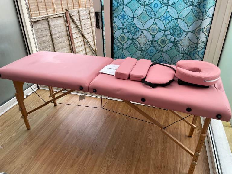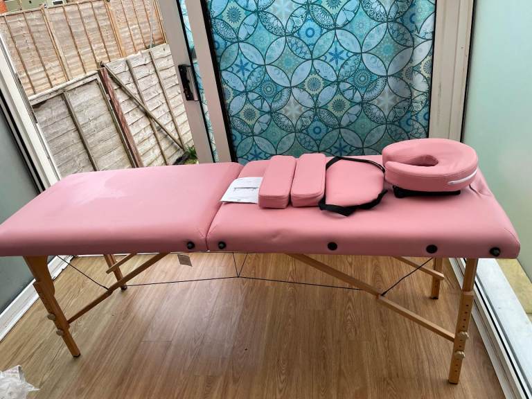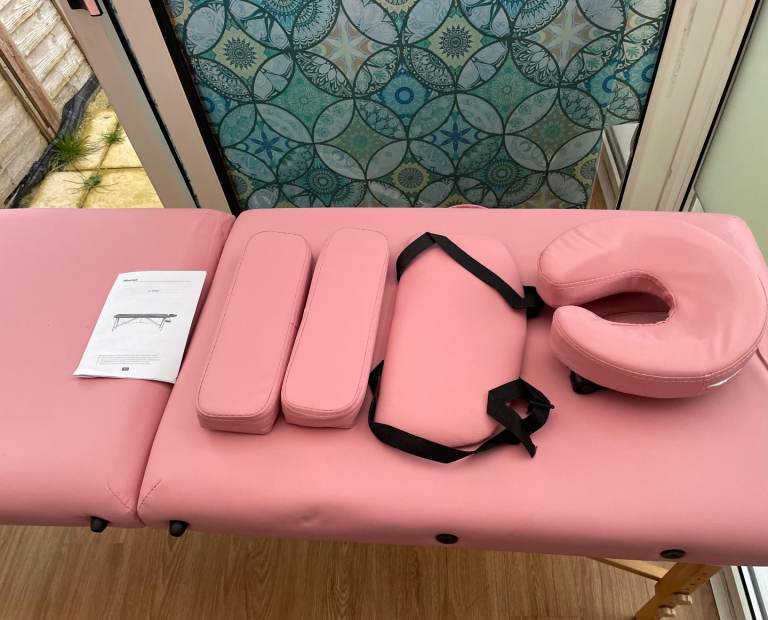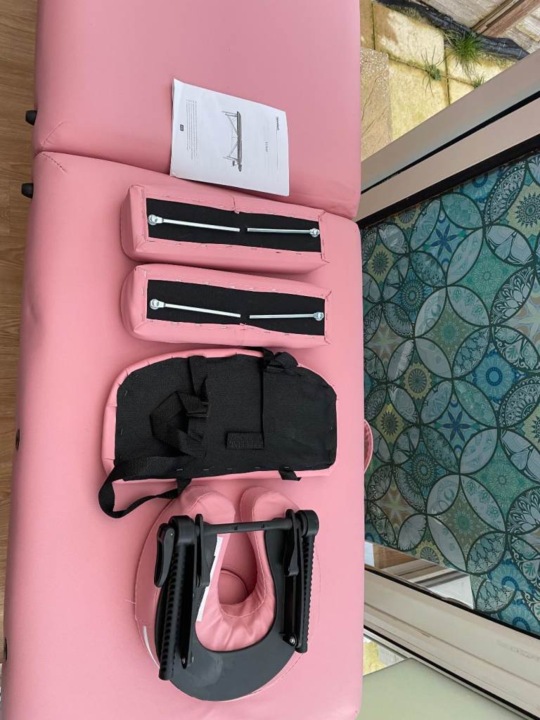 Comfortable and sturdy portable massage table with padded surface, adjustable height, and foldable design for easy storage and transport. Includes face cradle, armrests, and headrest and pink bed comfy cover