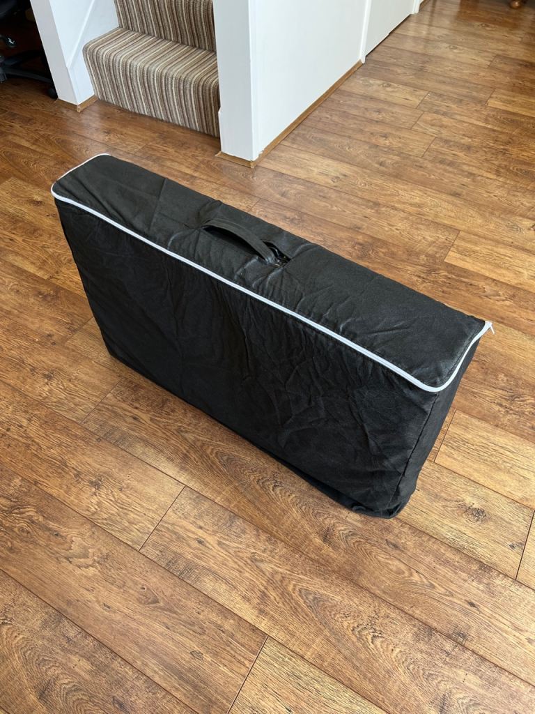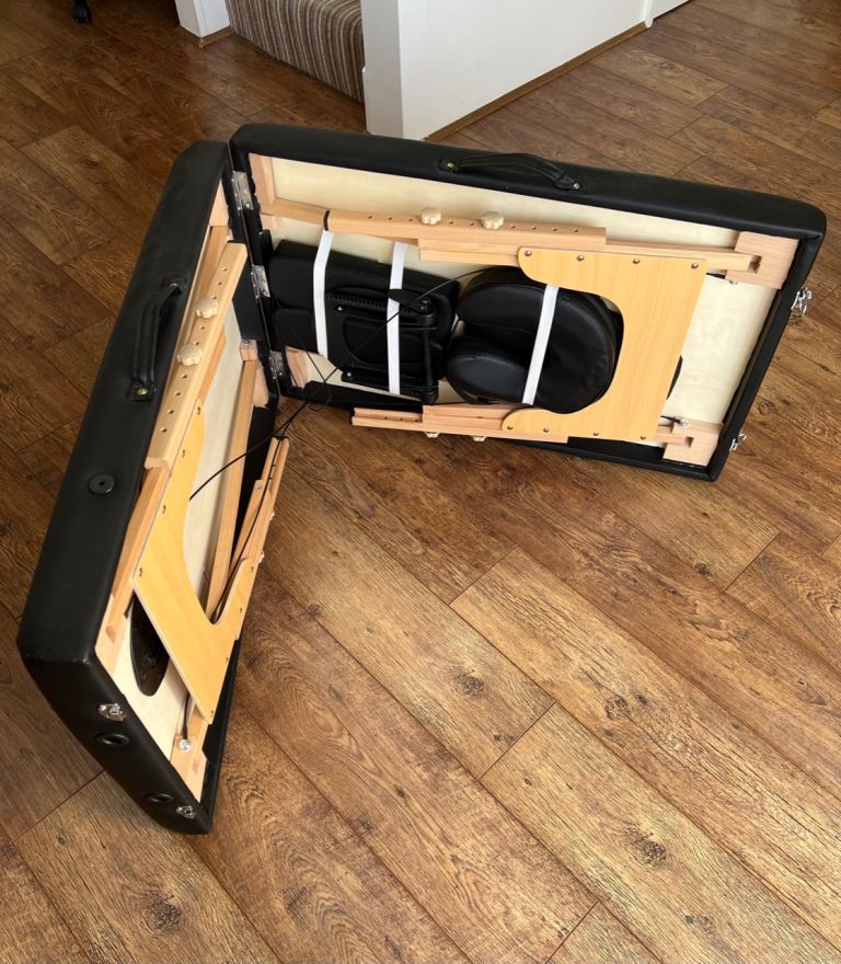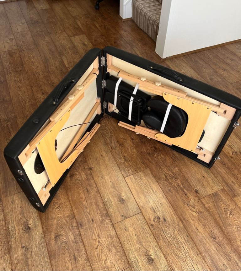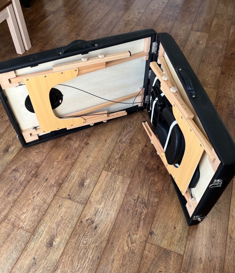 Portable massage table with all original accessories included (head rest extension, face cushion, arm rests and cover). Excellent condition (as new).
