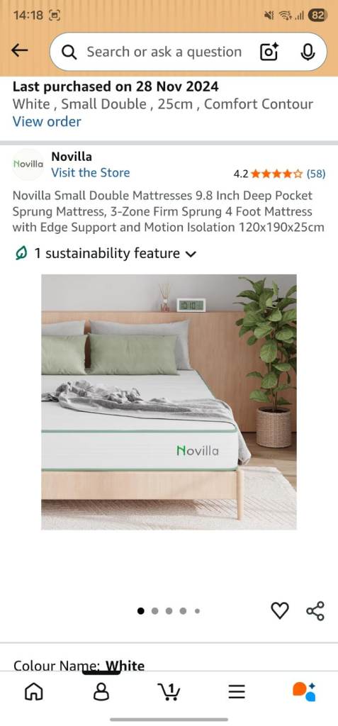 In very good condition Novilla small double mattress. Bought from amazon November 24. I don't need it now as i ordered a new orthopaedic mattress which is coming on Friday. Avaliable for collection from Friday 24th april.