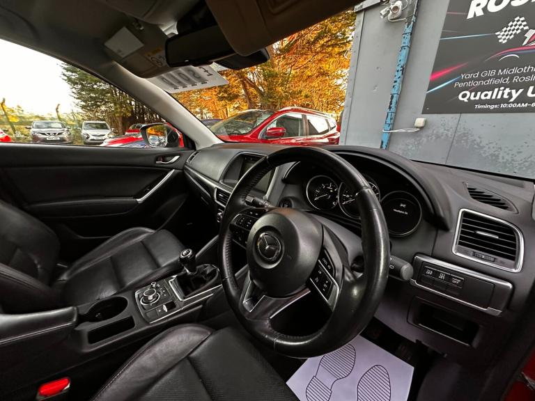 For sale is this stylish and premium 2015 Mazda CX-5 2.2d Sport Nav 5dr, finished in a vibrant red. With 75,208 miles on the clock and priced at £6,495, this highly-rated SUV is a superb choice for families and enthusiasts alike. It has been well cared for with only 1 previous owner and comes with 2 keys. It boasts a part service history with 5 service stamps, offering great reassurance. The Sport Nav trim is the top specification, featuring a wealth of luxury items including satellite navigation, a reversing camera, full leather interior, a large infotainment screen, and keyless entry/start. The powerful and efficient 2.2 diesel engine is Euro 6 ULEZ Compliant and delivers excellent performance, with an annual road tax of just £35 a year. For your complete reassurance, this car has an MOT valid until November 2026 and comes with our standard 6-month warranty and 6 months free breakdown recovery. This Mazda CX-5 is a fantastic choice for anyone seeking a luxurious, economical, and dependable SUV. To arrange a viewing or test drive, please call for a phone enquiry. Delivery available in Edinburgh and the surrounding areas. Roslin Cars Yard G1B, Midlothian Innovation Centre, Pentlandfield, Roslin, Midlothian EH25 9RE Red, £6,495 Roslin Cars
