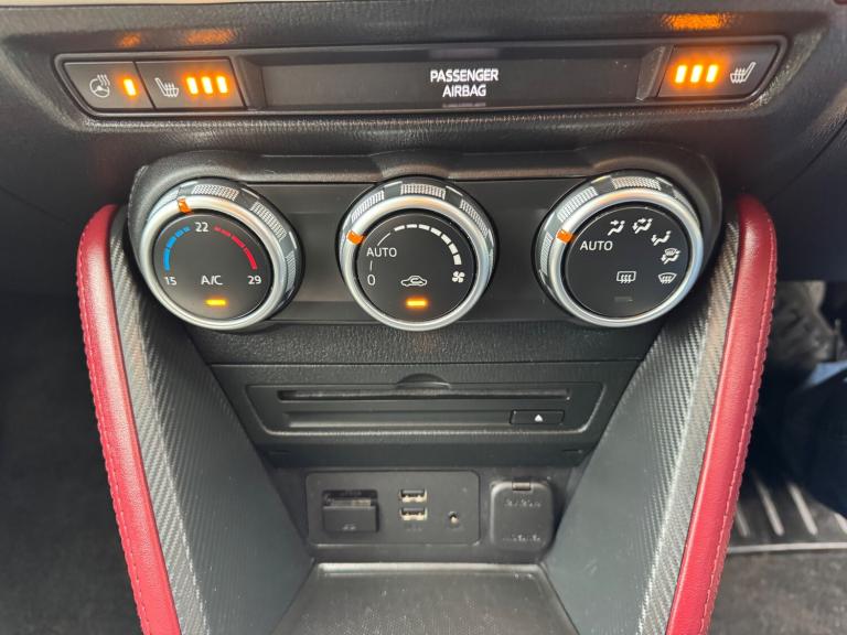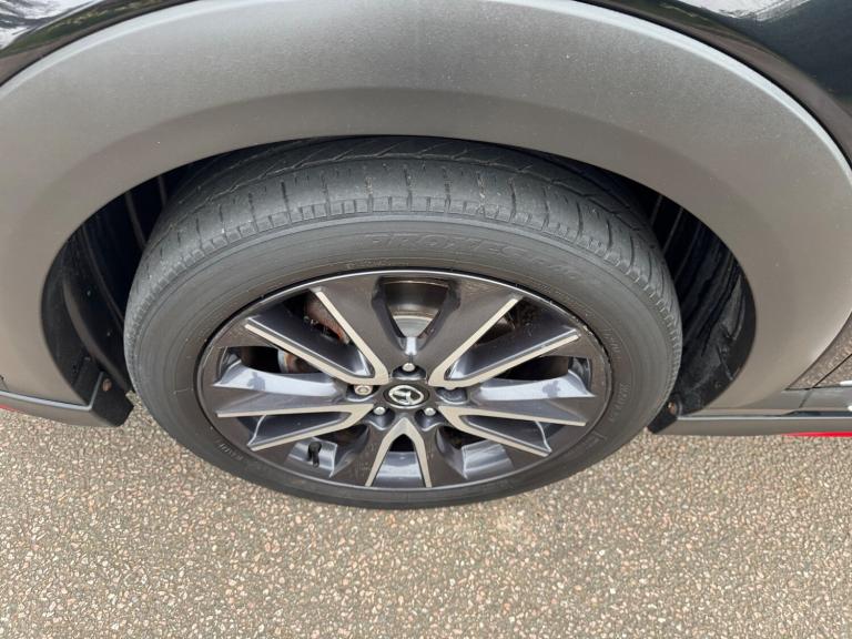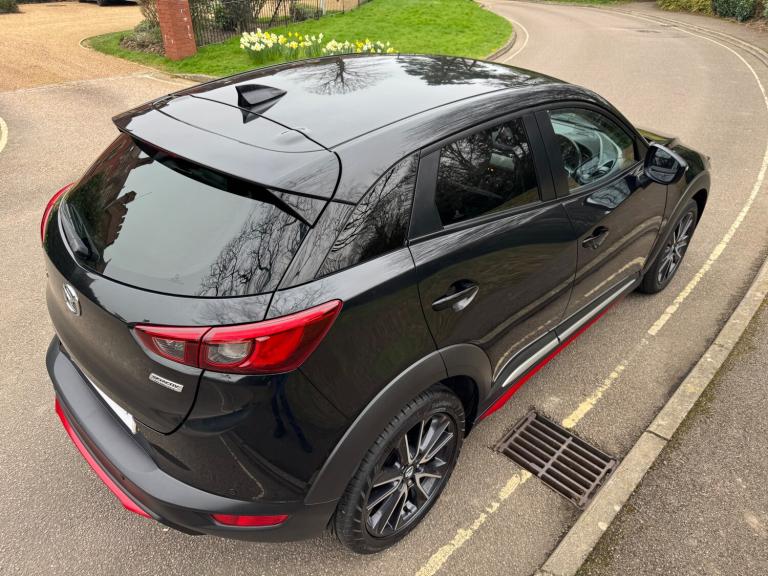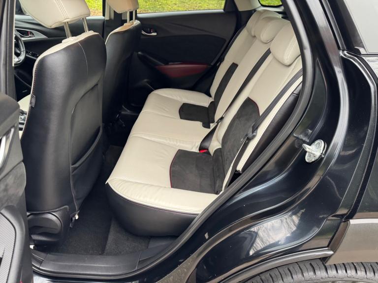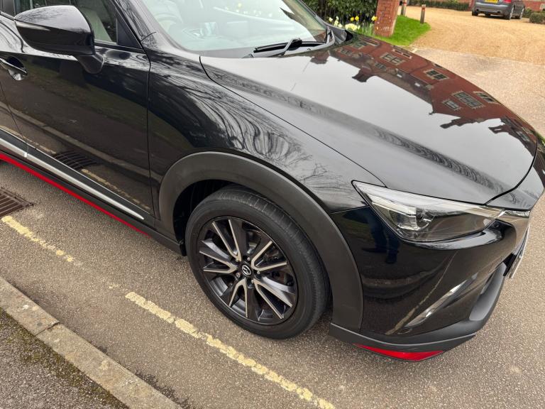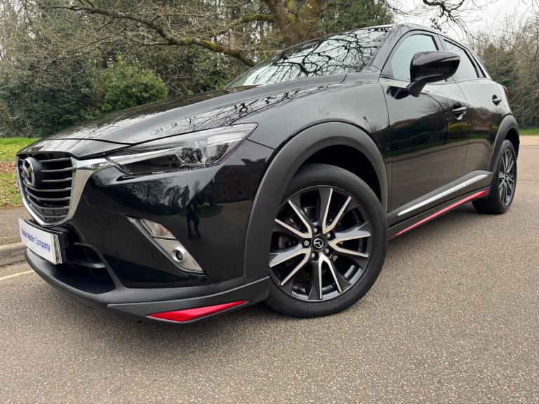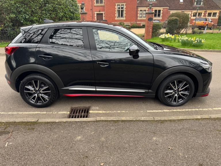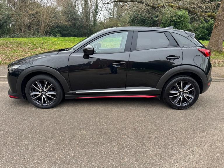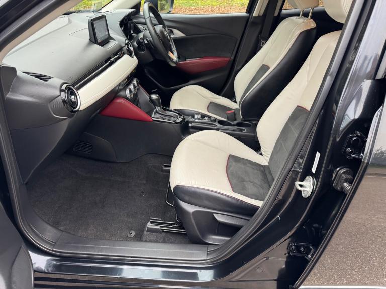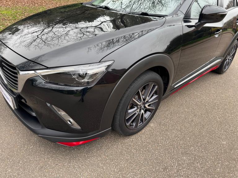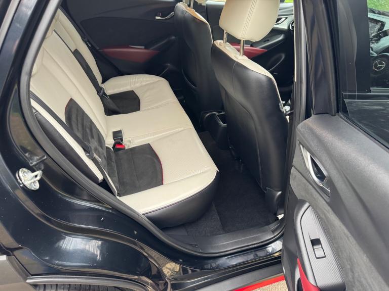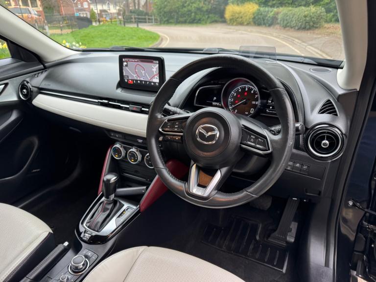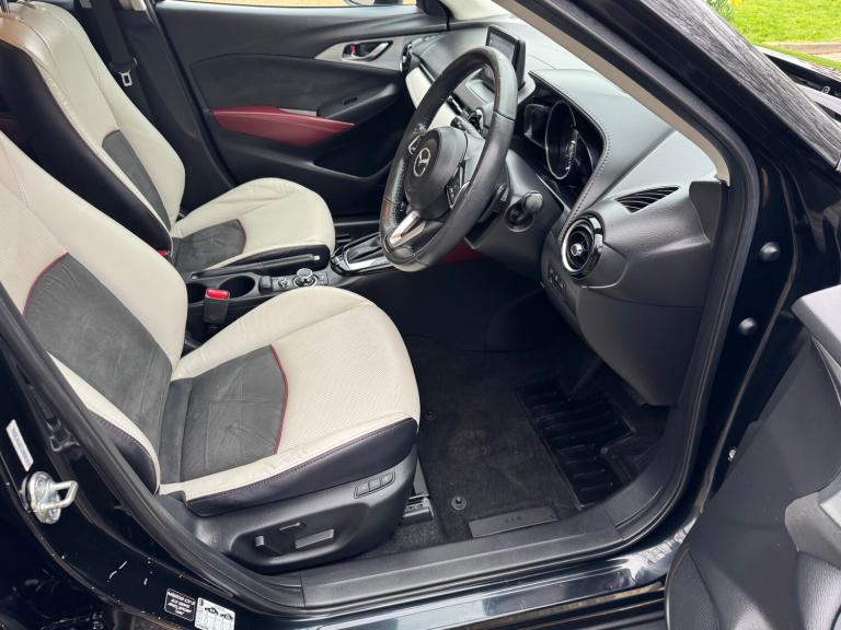 This 2018 Mazda CX-3 2.0 SKYACTIV-G Sport Nav SUV has a mileage of 56865 miles and runs on petrol, with an MOT that expires on 30/03/2026. It comfortably seats 5 individuals across its 5 doors and is ULEZ compliant, making it suitable for city driving. The SUV comes with a Safety Pack, complemented by a luxurious Leather-Lux Suede interior in Half Stone and Half Black with Red Piping. Its Jet Black exterior is accented by 18in Alloy Wheels in Gunmetal, and its Door Mirrors are electrically adjustable, heated, folding, and feature turning signals, adding both practicality and sophistication to this stylish vehicle. Features Include: , 18in alloy wheels - gunmetal, door mirrors - electrically adjustable-heated-folding-turning signal, dual exhaust system, electric windows - front and rear with one touch auto up and down on drivers side, emergency tyre repair kit, privacy glass - rear and rear side windows, radiator grille - silver accent, side sill trim - chrome accent, 7in colour touch screen display, am-fm dab radio - single cd-mp3 premium bose sound system with 7 speakers, aux and 2 usb inputs, aha app and stitcher app integration, bluetooth audio streaming, integrated bluetooth system, satellite navigation - european mapping with 3-years map updates, shark fin antenna, air conditioning - automatic climate control, courtesy light with integral spotlights, door pockets - driver - front passenger and rear, engine start-stop button, front knee pads - dark red - soft-touch with stitching, gear knob - leather-wrapped with satin silver surround, glovebox, grab handles - two rear with coat hooks, handbrake - leather wrapped, heated steering wheel, inner door handles - chrome, luggage compartment - flexible floorboard for adjustable floor height or secure separate storage space, luggage compartment - light, luggage compartment - tonneau cover, rain-sensing front wipers, seatback pocket - rear of front passenger seat, seats - 60-40 split folding rear, seats - drivers manual slide-recline and height adjustment, seats - front heated, seats - front passenger manual slide and recline adjustment, steering wheel - leather, steering wheel - mounted audio and bluetooth controls, steering wheel - paddle shift, steering wheel - telescopic and tilt adjust, sunvisors - driver and front passenger with vanity mirror, airbags - front passenger deactivation system, anti lock braking system - 4w-abs, dual front airbags, dynamic stability control with traction control system, eba -