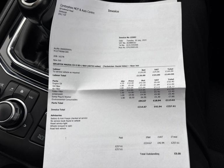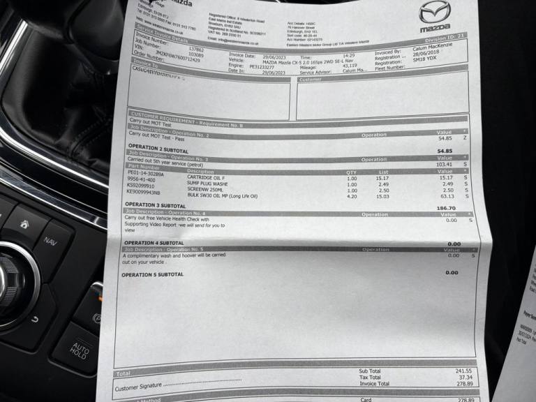 This 2018 Mazda CX-5 SKYACTIV-G SE-L Nav presents a compelling proposition with its remarkably low mileage of just 56,745 miles for its age. This particular example, a Euro 6 compliant 2.0 litre petrol model, benefits from an MOT valid until July 2026, offering peace of mind for the coming years. The SE-L Nav trim level ensures a well equipped driving experience, featuring dusk sensing automatic headlights with LED technology and auto levelling, alongside front and rear parking distance sensors to aid manoeuvrability. Further enhancing its appeal, this Mazda CX-5 includes integrated Bluetooth for seamless connectivity and dual zone climate control, allowing both driver and passenger to set their preferred temperature. Its low insurance group rating is a significant advantage, suggesting lower running costs. These combined attributes, including the low mileage and comprehensive features, position this CX-5 as an excellent choice compared to other vehicles in its class..17in Alloy Wheels, 7in Colour Touch Screen Display, ABS - Anti Lock Braking System, AM-FM-DAB Radio - Single CD Player-MP3 Audio System with 6 Speakers, AUX and USB Input, Air Conditioning - Dual Zone Climate Control, Auto Dimming Rear View Mirror, Bumpers - Body Coloured, Cruise Control with Manual Speed Adjustment, Dome Interior Courtesy Light with Integrated Spotlight, Door Mirrors - Electrically Adjustable - Heated - Power Folding with Integrated Indicator Lights, Door Pockets - Driver - Front Passenger and Rear, Dual Exhaust System, Dual Front Airbags, Dusk Sensing Automatic Headlights, Dynamic Stability Control with Traction Control System, Electric Windows - Front and Rear with One-Touch Auto Down - Up and Timer Function, Electronic Parking Brake with Auto-Disengage Function, Emergency Tyre Repair Kit, Engine Start-Stop Button, Front Centre Console with Storage Box, Front Fog Lights - LED, Front Passenger Airbag Cut-Off Switch, Front Side Airbags, Front and Rear Curtain Airbags, Front and Rear Parking Distance Sensors, Gear Shift - Leather-Wrapped, Glovebox Illumination, Grab Handles - Front Passenger and Two Rear with Coat Hooks, Head Restraints - Rear, Headlights - Adaptive Front Lighting System, Headlights - Coming-Leaving Home, Headlights - LED with Auto Headlight Levelling, Hill Hold Assist, ISOFIX Child Seat Anchorage for Outer Rear Seats, Integrated Bluetooth, Karakuri Tonneau Cover, LED Daytime Running Lights, Luggage Compartment - Light, Luggage Compartment - Power Outlet, Mazda Navigation System - European Mapping with Alternative Route Calculations - Point of Interest Search and 3-Years Free Map Updates, Multimedia Commander, Power Assisted Steering - Electronic, Privacy Glass - Rear and Rear Side Windows, Rain-Sensing Front Wipers, Rear Air Vents, Rear Seats - Centre Armrest with Two Cupholders, Rear Seats - Manual Recline Adjustment, Remote Central Locking with Deadlocking, SCR - Secondary Collision Reduction, Seat - 40-20-40 Karakuri Fold Flat Rear, Seatback Pocket - Driver and Front Passenger, Seatbelt Reminder for Front and Rear, Seatbelts - Front - 3 Point - ELR x 2 with Pre-Tensioners, Seatbelts - Rear - 3-Point - ELR, Seats - Drivers Manual Lumbar Adjustment, Seats - Drivers Manual Slide-Recline and Height Adjustment, Seats - Front Passengers Manual Slide-Recline and Height Adjustment, Shark Fin Antenna, Smart City Brake Support, Spoiler - Rear Roof Body Coloured, Steering Wheel - Leather Wrapped, Steering Wheel - Mounted Audio an