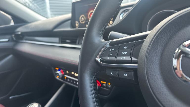 The 2021 Mazda6 Saloon Kuro Edition is a striking and sophisticated special-edition model that blends premium styling with a sporty, understated presence. Finished in a sleek grey metallic paintwork, the car carries an elegant, modern look that enhances the flowing lines of Mazda’s Kodo design language. The colour pairs perfectly with the car’s black exterior accents, including jet-black door mirrors and distinctive 19-inch black alloy wheels, giving the Kuro Edition an exclusive, performance-inspired edge.Inside, the Mazda6 Kuro Edition offers a cabin that feels both premium and unique. Deep burgundy leather seats provide a bold contrast to the muted exterior, creating an interior that feels warm, refined and genuinely special. High-quality materials, sculpted surfaces and thoughtful ergonomics contribute to a comfortable and driver-focused environment. The specification is generous, offering features such as heated front seats, a heated leather steering wheel, dual-zone climate control, keyless entry and a premium audio system, making every journey feel calm and composed.Power comes from Mazda’s naturally aspirated 2.0-litre Skyactiv-G petrol engine, delivering smooth and responsive performance through a six-speed manual transmission. The engine’s linear power delivery suits drivers who appreciate precision and refinement over raw power, while the car’s balanced chassis, direct steering and composed suspension tuning ensure confident handling on both city streets and open roads.Overall, the 2021 Mazda6 Kuro Edition in grey metallic stands out as a rare and stylish saloon. It offers a perfect blend of exclusivity, comfort and driving enjoyment, wrapped in a distinctive and beautifully appointed package..Air Conditioning, Climate Control, Metallic Paint, Cruise Control, Satellite Navigation, Alloy Wheels, DAB Radio, Bluetooth, Parking Sensors, Stop Start, USB, Auto Lights& Rain Sensors, Rain sensing front wipers, Privacy glass, Windscreen wiper de-icer, Electric front/rear windows/one touch facility, G-Vectoring control plus, Front Advanced Smart City Brake Support (SCBS), DSTC-Dynamic Stability and Traction Control, ABS + EBD + EBA, Electronic parking brake with auto hold, Hill hold control, Emergency stop signalling system, Bluetooth connectivity with voice control, Audio transfer from Bluetooth devices, Wireless Apple CarPlay and wired Android Auto, E-call, Traffic sign recognition, Radar cruise control, Adjustable speed limiter, Blind spot monitoring with rear cross traffic alert, Intelligent speed assist, Lane keep assist system (LAS) with Lane departure warning system (LDWS), Electric power steering, Reversing camera, Front and rear parking sensors