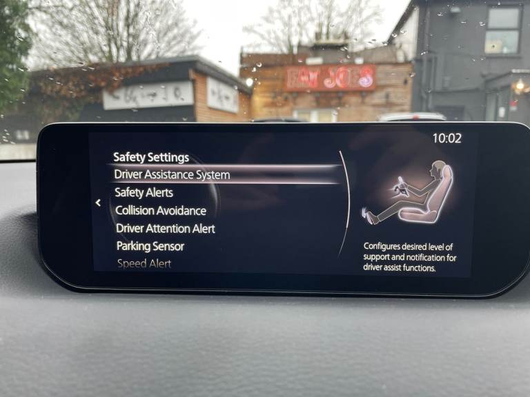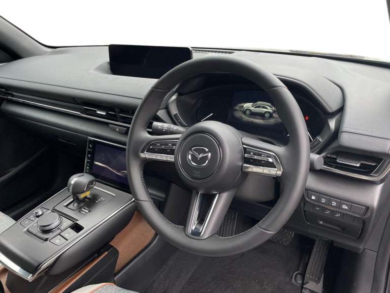 ..Driver Convenience,Adaptive Cruise Control,Blind Spot Monitoring with Rear Cross Traffic Alert,Digital Instrument Cluster,Drive Mode Switch,Driver Attention Alert - DAA,Head-Up Display,Multimedia Commander,Parking Aids - Reversing Camera,Parking Sensors - Front and Rear with Audible and Visual Warning,Service Indicator,Traffic Sign Recognition,Trip Computer,Tyre Pressure Monitoring SystemEntertainment,10.25 Colour TFT Centre Display,12V Electrical Power Outlet,2x USB-C Input,DC Socket for Rapid Charging up to 40KW,e-Call with GPS,FM - DAB Radio with 8 Speakers,Integrated Bluetooth,Mazda Connected Services,Mazda Hybrid Navigation System,Wireless Apple CarPlay and Wired Android AutoExterior,18in Alloy Wheels - Black - Diamond Cut,B-Pillar and C-Pillar Garnish - Gloss Black,D-Pillar Garnish - Satin Plated,Door Mirrors - Gloss Black - Electrically-Adjustable - Heated - Auto Power Folding,Electric Windows - Front,Emergency Tyre Repair Kit,Front Grille - Black Finish,Kodo Turn Signal,Lower Bumper Wheel Arch and Side Mouldings - Satin Black,Privacy Glass - Rear Sides and Rear Window,Rear Roof Spoiler - Gloss BlackInterior,Air Conditioning,Bright Finish Interior Trim Accents - Steering Wheel Centre Bezel - Surround Start-Stop and Glove Box Handle,Colour 7inch TFT Display,Door Panel Trim - Cloth with Artificial Leather Armrest and Cork Inserts Around Inner Door Handle,Drivers Seat Power Slide - Recline - Height - Tilt and Lumbar Adjustment with Head-up Display and Driver Door Memory,Frameless Auto Dimming Rear-View Mirror,Front and Rear with LED Lighting,Front Armrest,Front Head Restraints,Front Passenger Seat - Manual Slide - Recline - Height Adjustment,Gear Shift - Leather-Wrapped,Glovebox with Interior Illumination,Grab Handles - Driver - Front Passenger and Two Rear with Coat Hooks,Interior Cork Accents - Mazda Heritage Cork on the Console Tray and Front Cupholder Lids,Luggage Compartment - LED Illumination,Power Start-Stop Button,Rain-Sensing Front Wipers,Rear Seats - 60-40 Split Fold Down,Rear Seats - Folding Centre Armrest Equipped with Two Cup Holders,Roof Lining - Ceiling and Pillars - Black,Roof Mounted Sunglasses Holder,Seatback Pocket - Located on Rear of Front Passenger Seat,Seats - Front Heated,Steering Wheel - Leather Wrapped,Steering Wheel - Tilt and Telescopic Adjustment,Steering Wheel Mounted Audio and Bluetooth Controls,Storage Spaces - Door Pockets,Storage Spaces - Front Centre Storage with Two Cupholders,Sunvisors - Drivers and Front