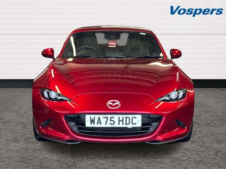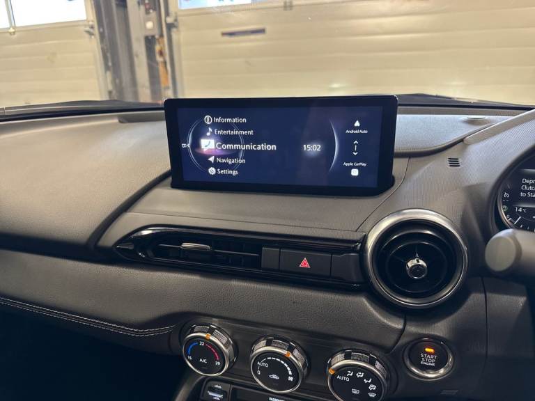 ..8.8'' Colour centre touch screen display with Mazda Connect infotainment, Aha and stitcher app, Analogue speedometer, Apple car play/Android Auto, Cruise control with Intelligent speed assist, Driver alert system, eCall emergency call system, Emergency stop signalling system, Engine start/stop button, Hands free phone preparation, Integrated bluetooth with hands-free calling, bluetooth audio and easy access to phone contacts, Integrated navigation system, Kinematic posture control, Lane departure warning system, Lane keep assist, Multi dot display tachometer and electric odometer, PAS, Rear parking sensor, Service indicator, Traffic sign recognition, Trip computer, Water temperature gauge, I-ELOOP, i-stop, 2 x USB Type-C inputs, Multimedia Commander including separate volume dial, Premium Bose sound system with 9 speakers with 2 in each front headrest, AM/FM/DAB radio and MP3, Steering wheel mounted audio/bluetooth controls, Adaptive front lighting system, Automatic headlamp levelling, Black scuff plates with stainless steel insert, Body colour bumpers, Body colour co ordinated interior upper door trim, Body coloured electric/heated door mirrors, Coming/leaving home lighting function, Dual exhaust pipes, Dusk sensitive headlamps, Electric front windows/one touch facility, Exterior body colour co ordinated upper door panel trim with black vinyl and silver stitching, Frameless auto dimming rear view mirror, Front intermittent wipers, LED 3rd brake light, LED daytime running lights, LED headlights with automatic headlight levelling, LED indicator lights, LED rear lights, Manually operated black premium cloth soft top with heated rear glass window, Piano Black fashion bars, Rain sensing front wipers, Rear boot, 12V socket, Centre console storage box, Chrome Air conditioning dials, Climate control air conditioning, Coin Box, Driver and front passenger sunvisors with covered vanity mirror and driver ticket holder, Driver seat manual slide, recline and tilt adjustment, Front centre armrest, Front head restraints, Gear shift indicator, Heated front seats, in 3 heat levels, Interior courtesy light, ISOFIX front passenger seat child seat compliance, Leather gear knob, Leather handbrake lever, Leather steering wheel, Lockable rear centre box with lid, Passenger seat + manual slide/recline adjust, Perforated leather upholstery, Single front passenger seat, Tilt/telescopic steering column, Two cupholders, Windblocker, 3 point ELR front seatbelts with pretensioners,
