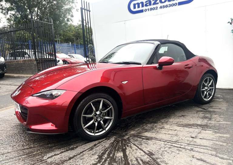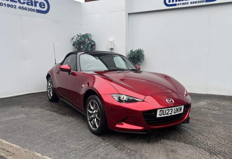 2023 Mazda MX5 1.5 Exclusive Line finished in Crystal Soul Red with contrasting black cloth hood and black leather. The car has covered just 4909 miles, serviced in May 2025 at Johnsons Mazda, is supplied with 2 keys and is HPI clear. The car benefits from a host of features including keyless entry, climate control air conditioning, cruise control, bluetooth, Carplay, cruise control, navigation. Iconic styling to legendary handling makes the Mx5 one of the best sports cars of all time and as a Mazda specialist we know how impressed customers are with their cars. Part exchange is welcome and finance options are available, for more assistance please call 01902 456300, visit [Website URL removed]