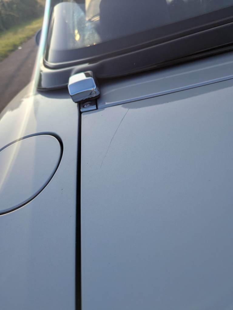 Leather softop is in good condition. Rear glass has been glued in the past and there are few small nicks where it goes over the windows.