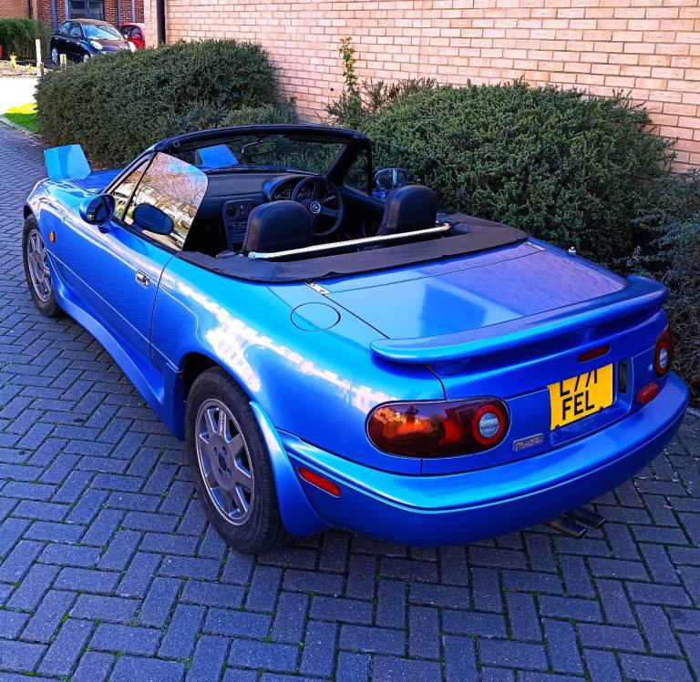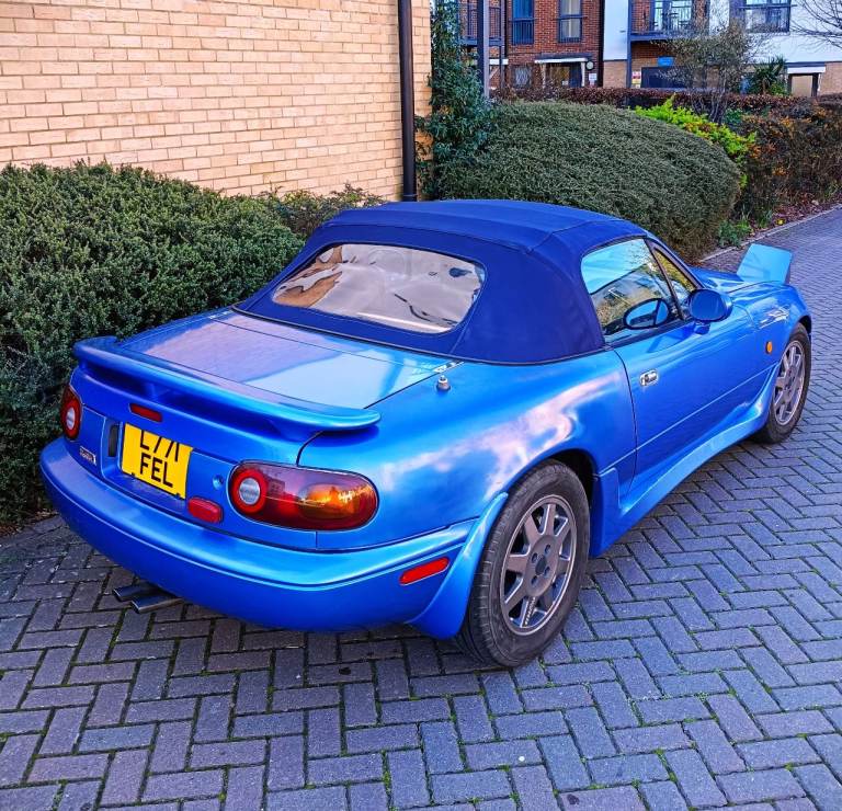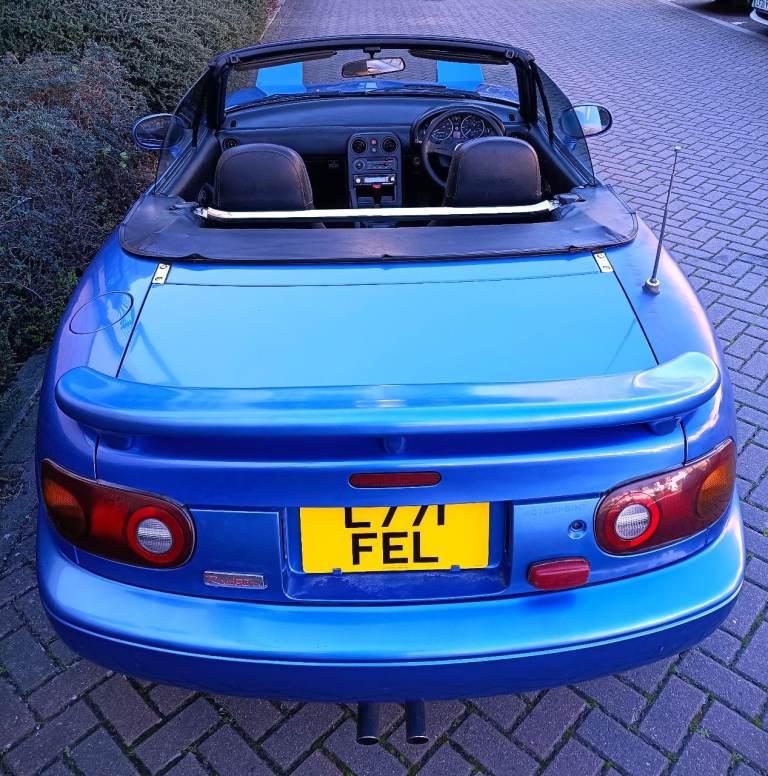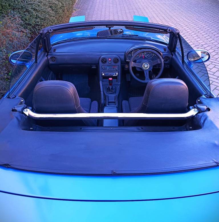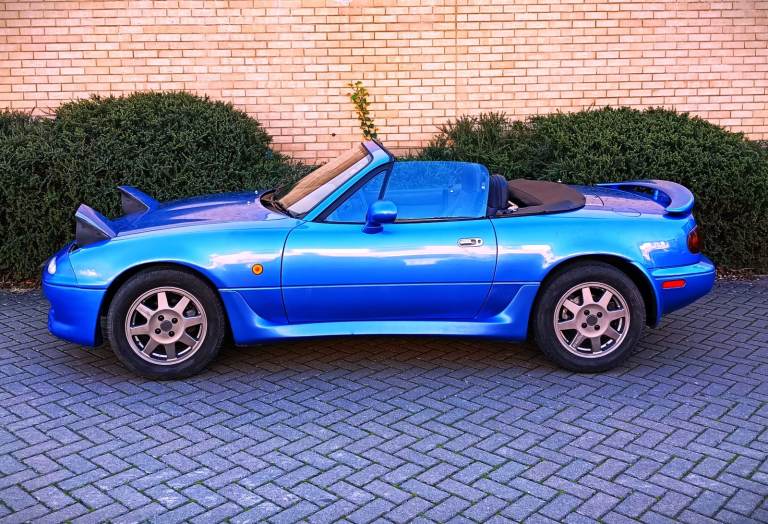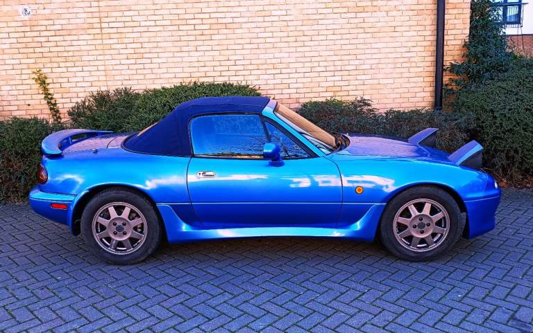 New racing brake discs and Pagid Racing brake pads fitted. The brake lines were all upgraded to braided racing hoses by previous owner. 15-inch Speedline Rally Alloy wheels (made in Italy), these are high performance wheels that cost £900. The tyres are all matching Toyo Proxy CF2’s with like new tread. Blue colour-coded mohair soft top roof with zip-down plastic window is in great condition. Genuine black leather tonneau cover included. Rear boot lid has the stylish rare Eunos spoiler that really suits this car.