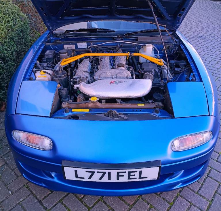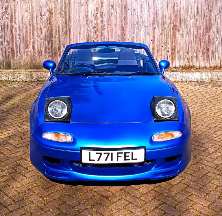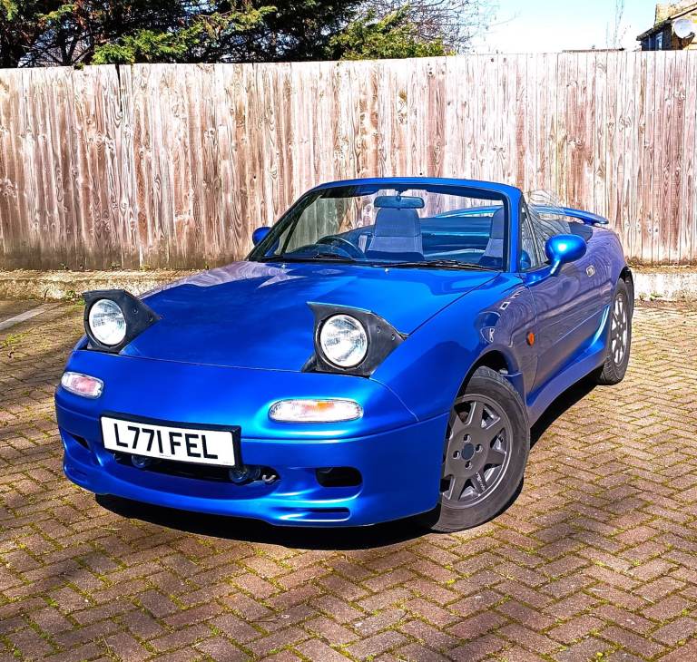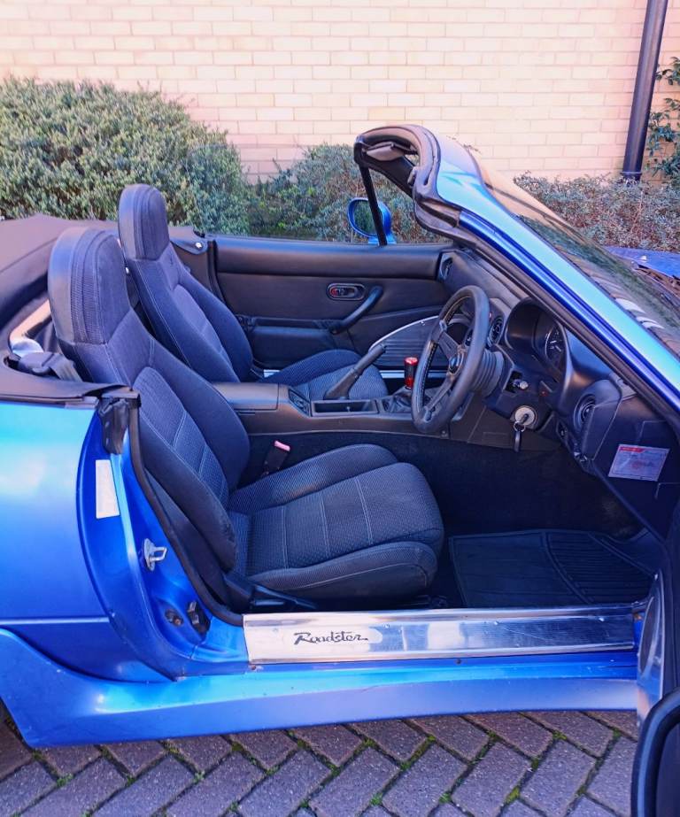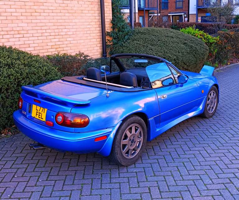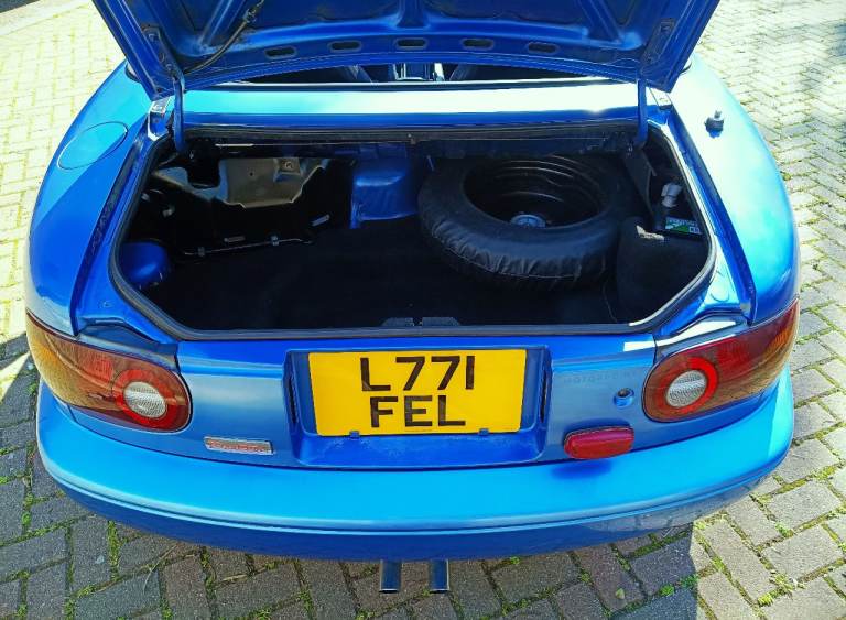 New racing brake discs and Pagid Racing brake pads fitted. The brake lines were all upgraded to braided racing hoses by previous owner. 15-inch Speedline Rally Alloy wheels (made in Italy), these are high performance wheels that cost £900. The tyres are all matching Toyo Proxy CF2’s with like new tread. Blue colour-coded mohair soft top roof with zip-down plastic window is in great condition. Genuine black leather tonneau cover included. Rear boot lid has the stylish rare Eunos spoiler that really suits this car.