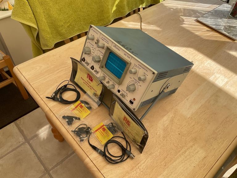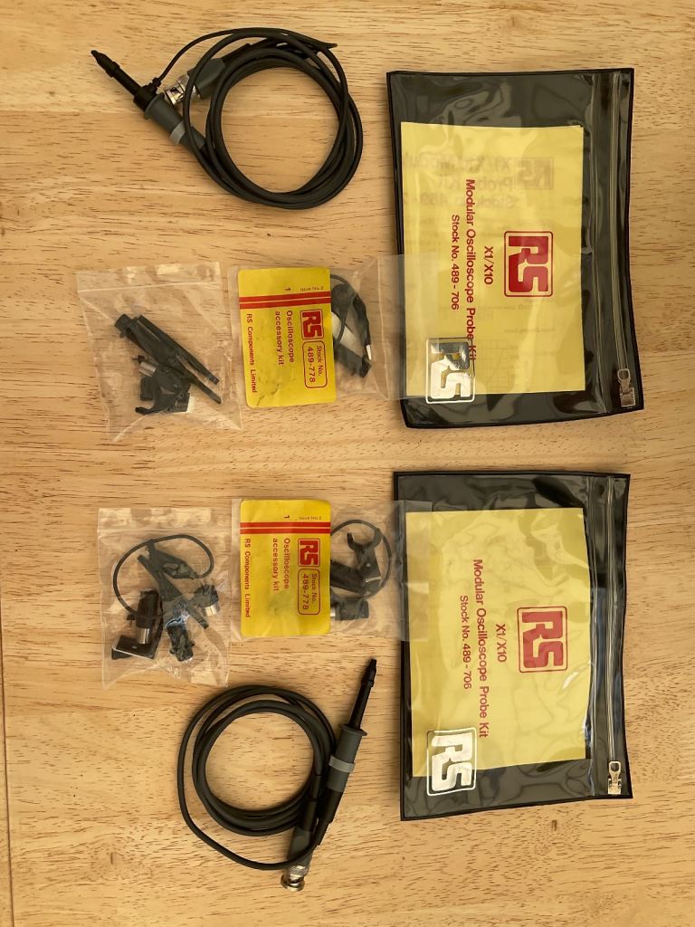 Scopex 4D 10A vintage oscilloscope in gwo complete with two as new unused complete RS x1/x10 250 MHz modular scope probes and two new unused RS modular probe replacement accessory kits. No longer used - wife wants to declutter hence all up for sale at less than the price of one probe! Buyer collect.