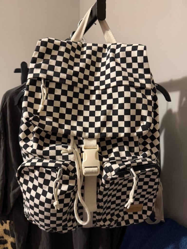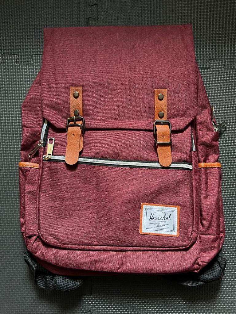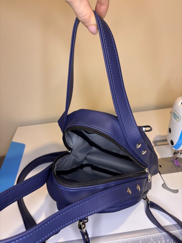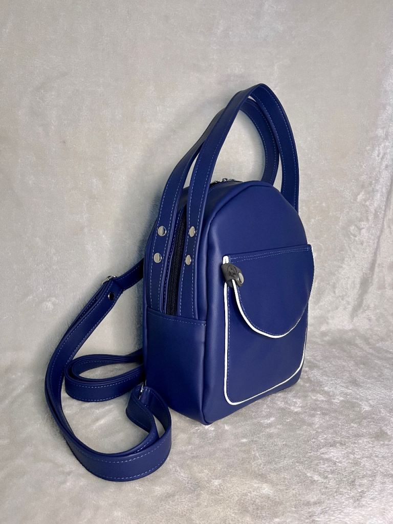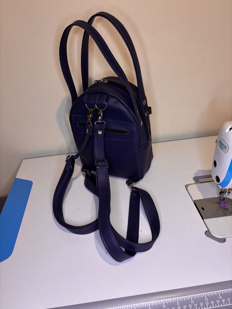 A small backpack made of faux leather with an exterior pocket with a magnetic closure. The pocket features reflective tape for added safety on the road, and one zippered pocket on the back. Inside, there's one zippered pocket and one slip pocket. Waterproof lining inside. The backpack can be carried by hand or on your back and is large enough to hold a book or even a small bottle of water. It's truly spacious and comfortable to use. .I highly recommend purchasing it.
