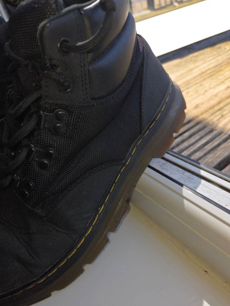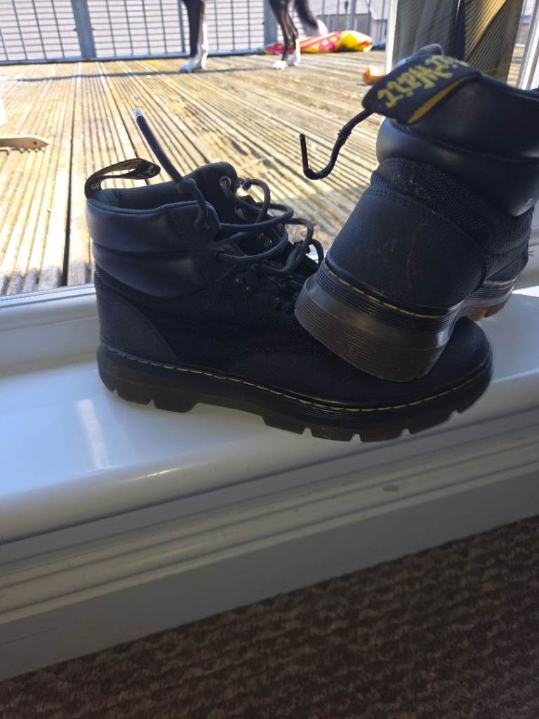 Selling a pair of Dr. Martens Combs boots in black. These are the "Extra Tough Nylon" version, which are much lighter and more flexible than traditional leather Docs while still being very durable.