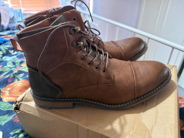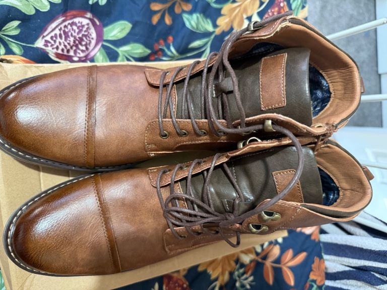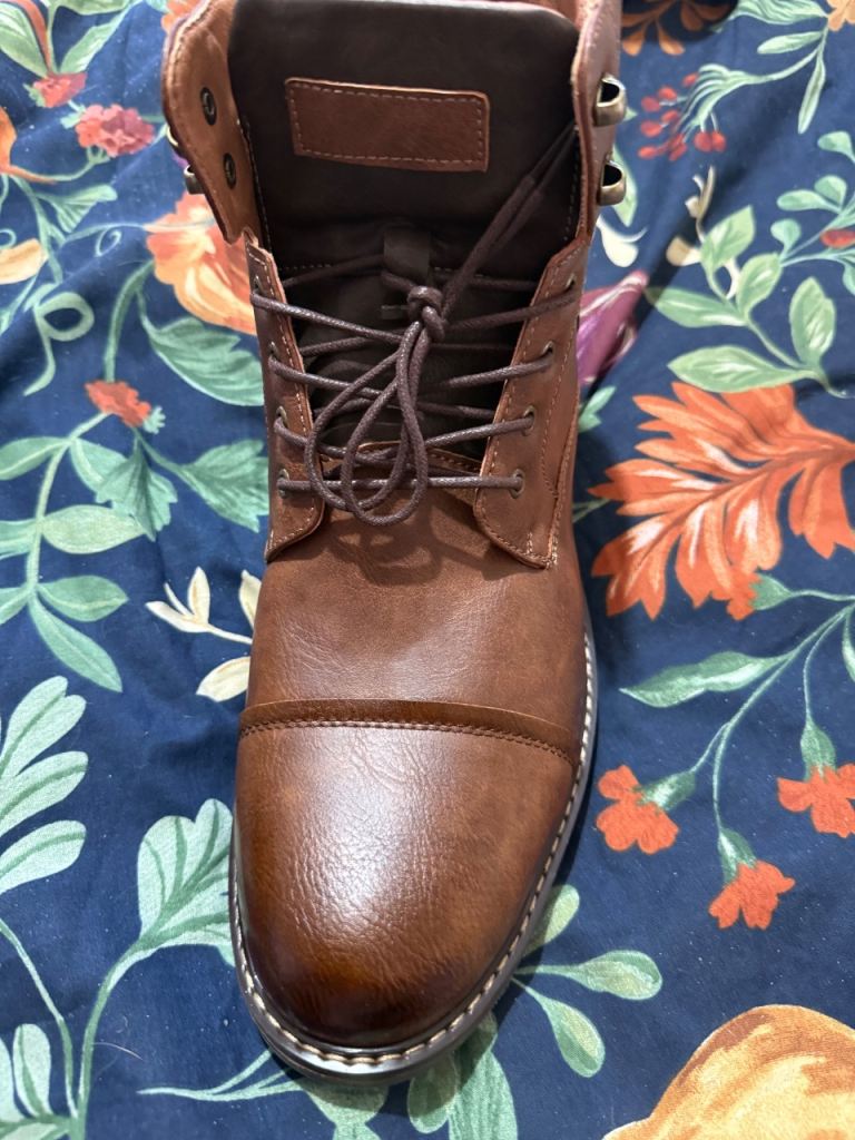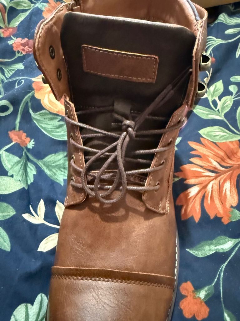 Men’s lace up zipper side brown mid calf boots.