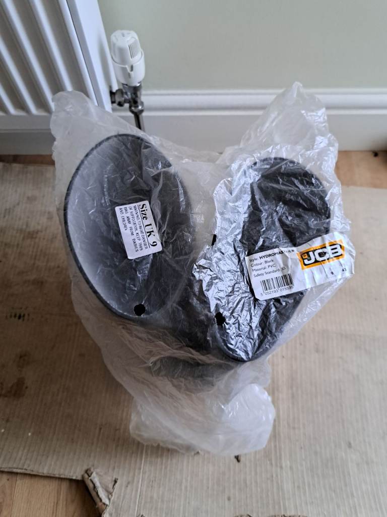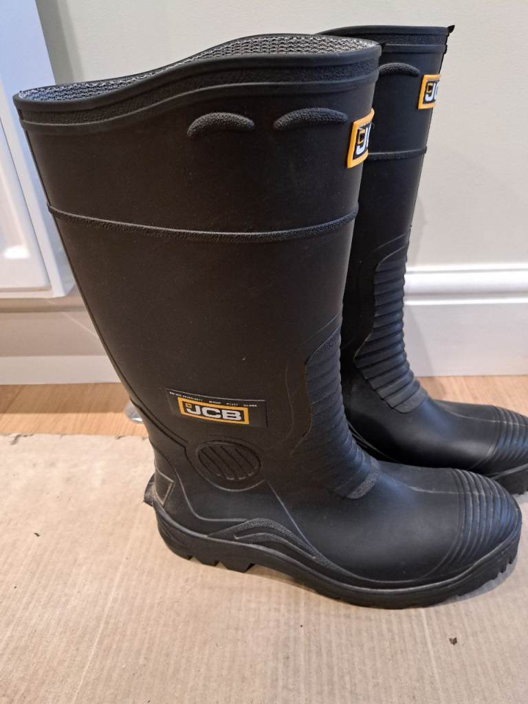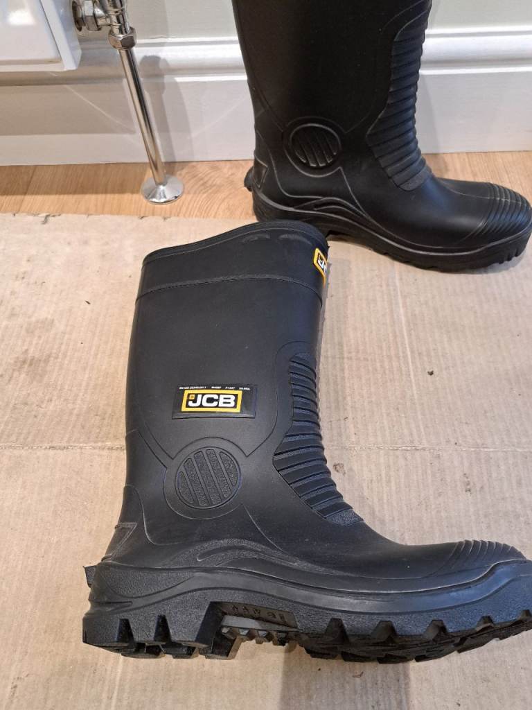 BRAND NEW PAIR OF JCB WELLIES - 100% WATERPROOF PVC UPPER, STEEL TOECAP AND MIDSOLE, PVC/NITRILE SOLE, LADDER GRIP SOLE, BOOT RELEASE TAB ON HEEL AND SCR SLIP RESISTANT. TEXT FOR MORE INFO. THANKS.