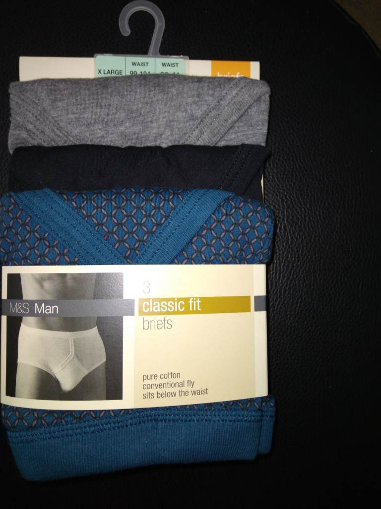 Brand new in original packaging mens m&s XL pack of 3 pure cotton classic fit briefs. Blue black and grey. £3.00.