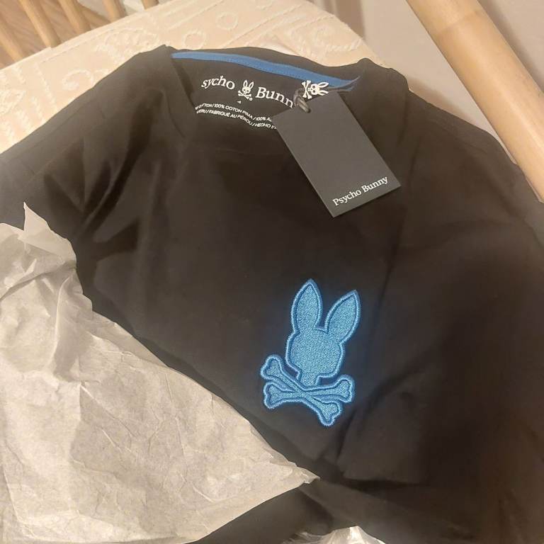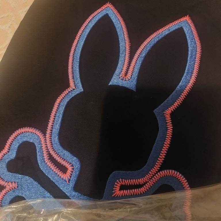 The large pink and blue appliquéd Psycho Bunny logo is located on the back.
