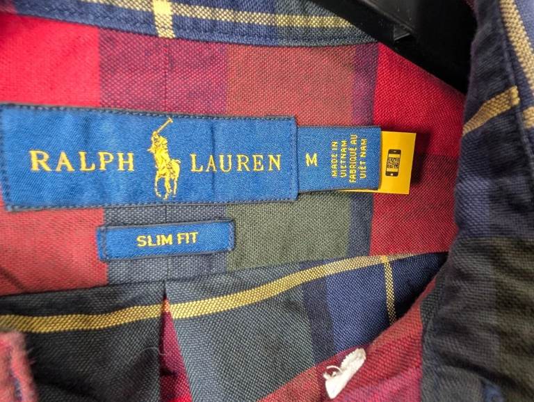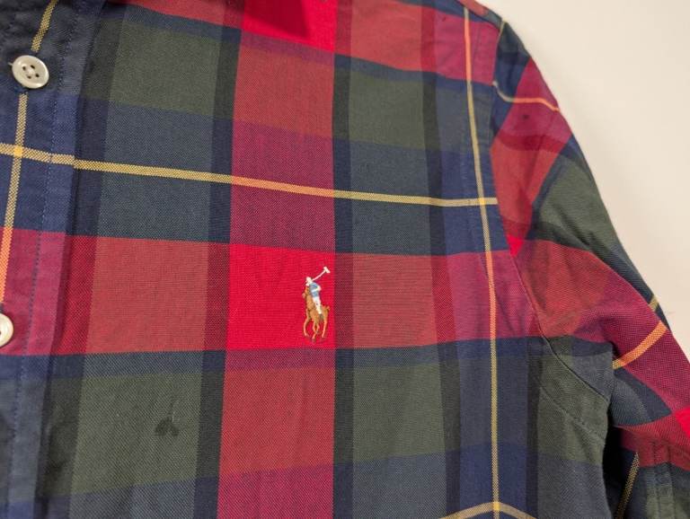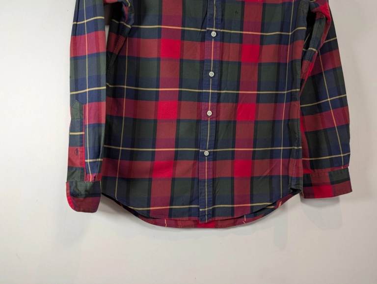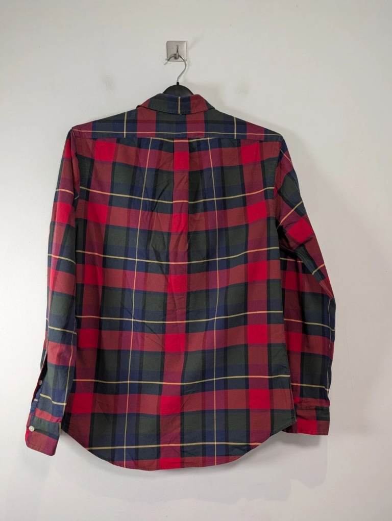 Ralph Lauren Slim Fit Shirt in a classic Red, Navy & Green Plaid, size Medium. Crafted from durable, soft-touch cotton with the iconic multi-colour embroidered pony.