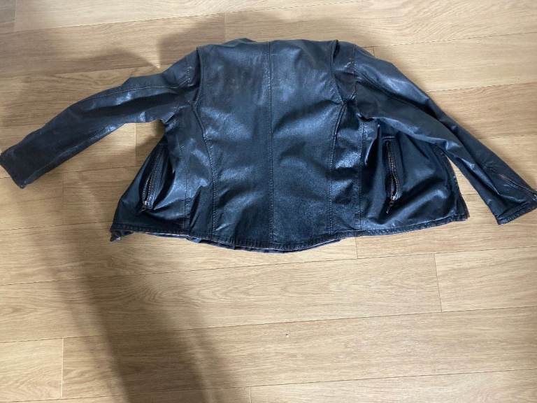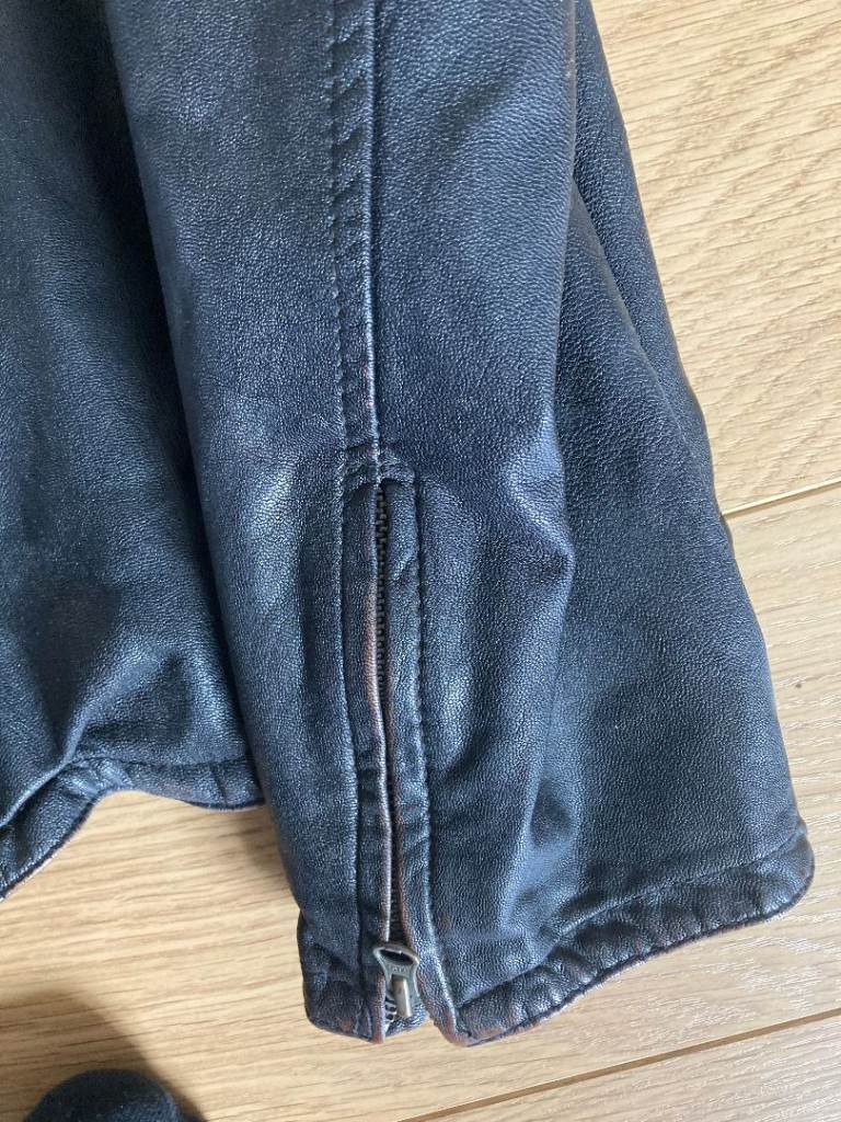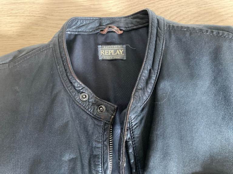 This is a very stylish Replay excellent quality leather cafe racer biker jacket used with a great patina all zips work with no issues no rips or tears it measures pit to pit 22inches pit to cuff 19inches full length 28 inches has had some patches removed but barely noticeable .