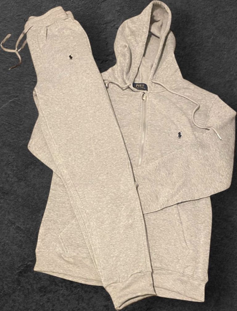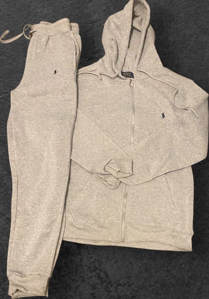 Authentic Ralph Lauren tracksuit in a classic grey colorway, featuring the iconic black Ralph Lauren logo for a clean, timeless look. Made from high-quality, soft-touch fabric that offers both comfort and durability. The tracksuit includes a full-zip top and matching bottoms, designed with a tailored yet relaxed fit for everyday wear or casual outings.