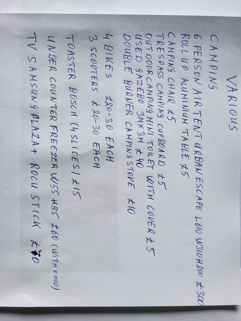 Also I'm selling camping items (picture) a long with bikes, scooters, TV, Freezer.