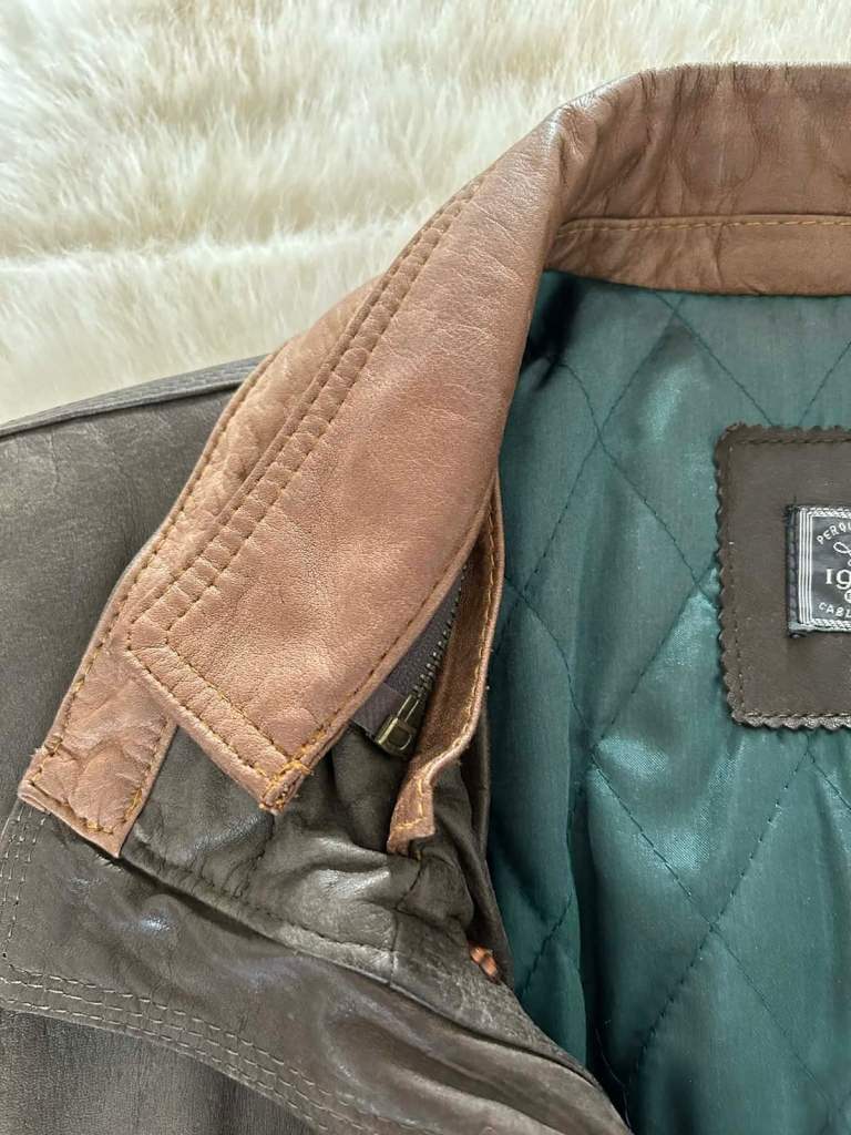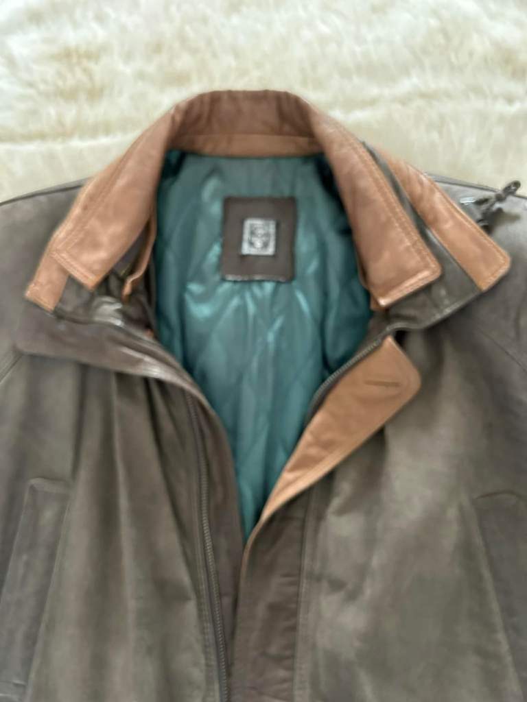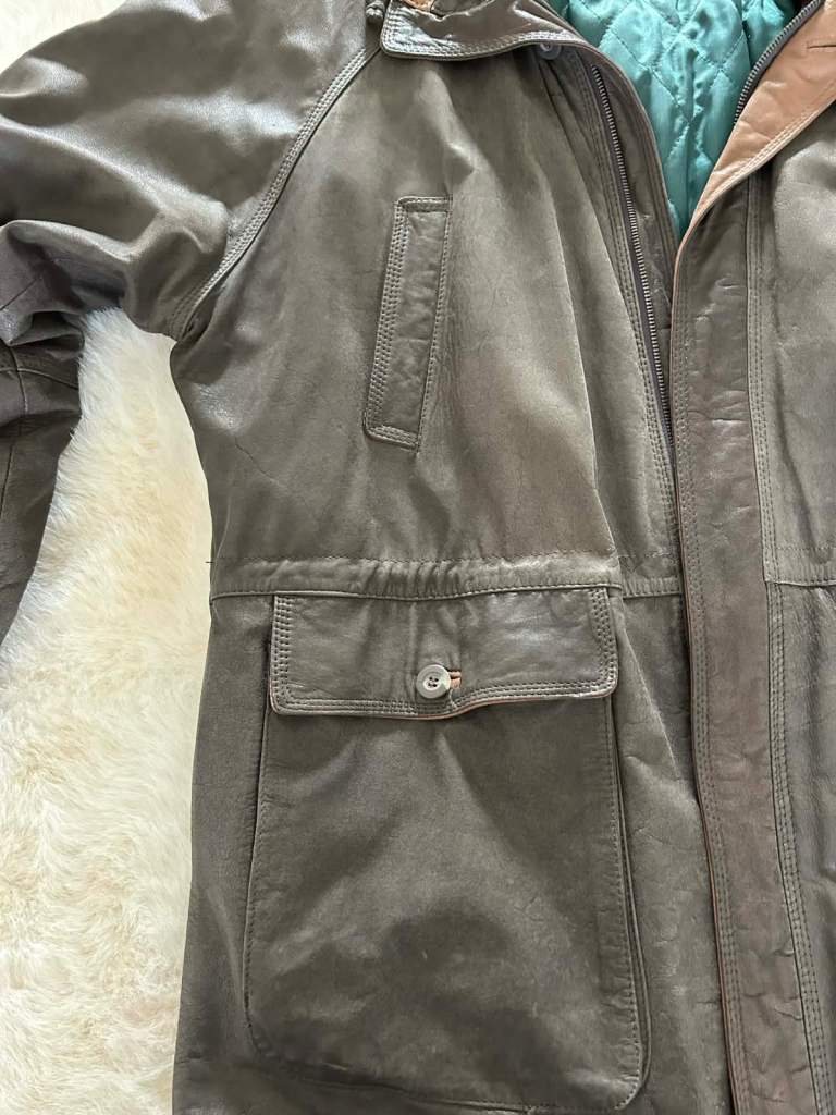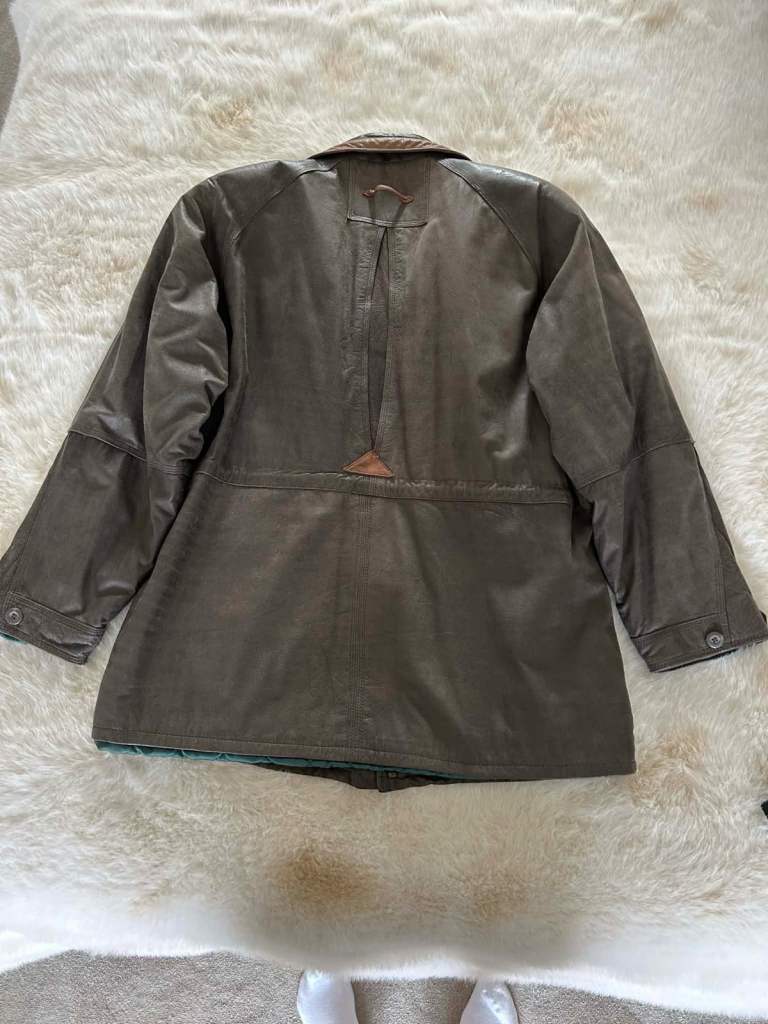 This is a rare listing and comes from the renowned Cable & Co quality shoe store that used to feature occasional fine crafted leather apparel. If you were lucky enough to be there at the right time you could find fine leather wear the likes of which couldn’t be matched elsewhere. This item is made from top quality Nappa leather and lined with an emerald quilted satin for warmth. The 2 capacious lower pockets are buttoned for security and have side access to keep your hands warm. The 2 upper slit pockets are handy for mobiles and the discrete zipped interior pocket for valuables. YKK zips are used throughout and the waist can be gathered in for a more fitted look. The internal collar is detachable and the outer high collar can be gathered in to make a nice snug fit around the neck. The cuffs can be buttoned down to stop draughts or stylishly left undone. It is labelled XL and would fit 46” to 48” with an inner sleeve of 22”. This is a coat for a lifetime and a real collectors item.