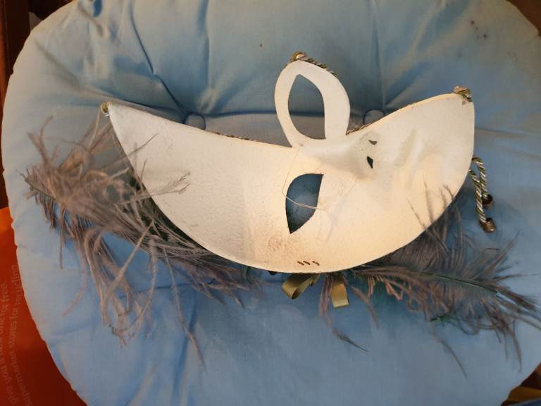 It is formed of rigid material - believed to be a form of plastic or papier mashe thus durable. It has a gold and white rope trim and green and white feather decoration.