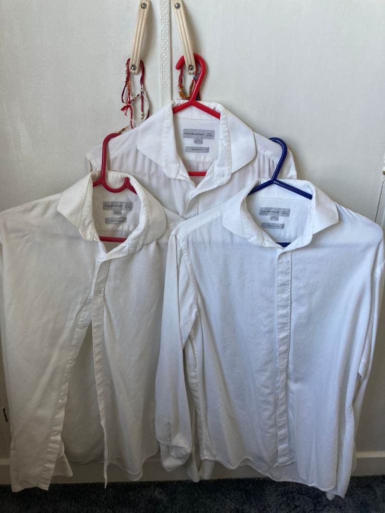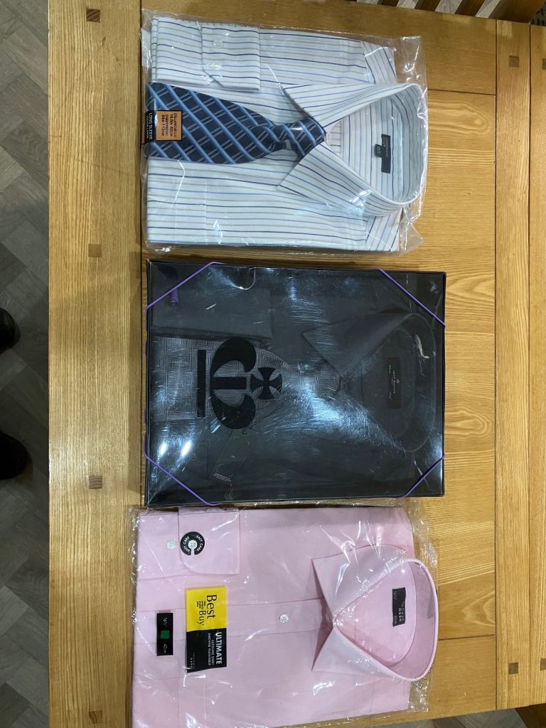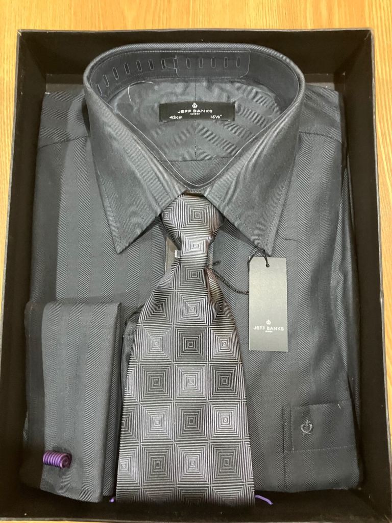 3 MENS SHIRTS , ALL IN ORIGINAL PACKING, HAVE NEVER UNPACKED, SIZE 16.5 LONG SLEVE. TOTAL MARKED PRICE FOR THE 3 SHIRTS IS. £79.50 . THE BOXED SHIRT IS. JEFF BANKS