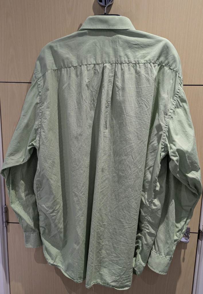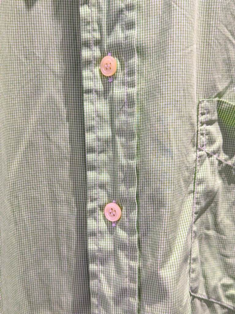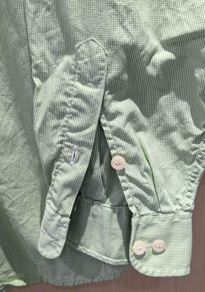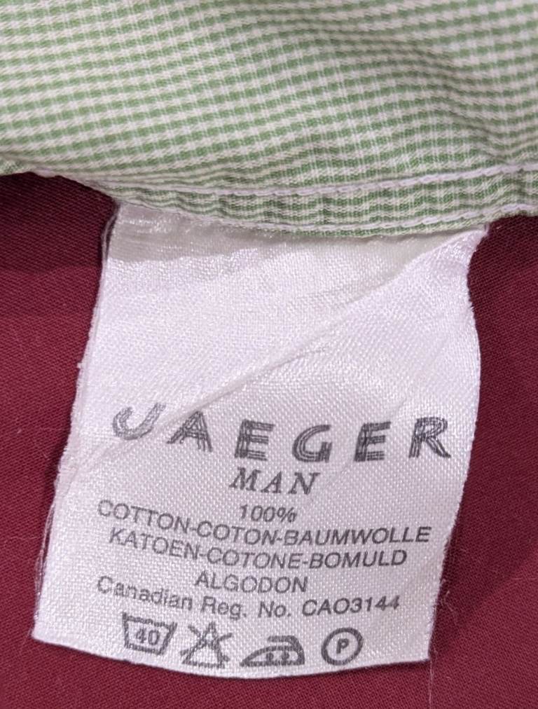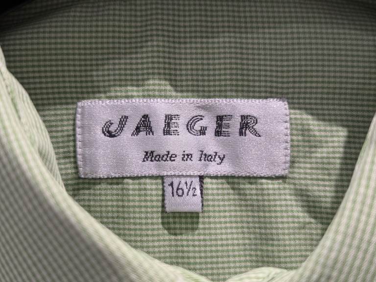 This is a vintage Jaeger long-sleeved mens dress shirt in a green and white check with the following features: