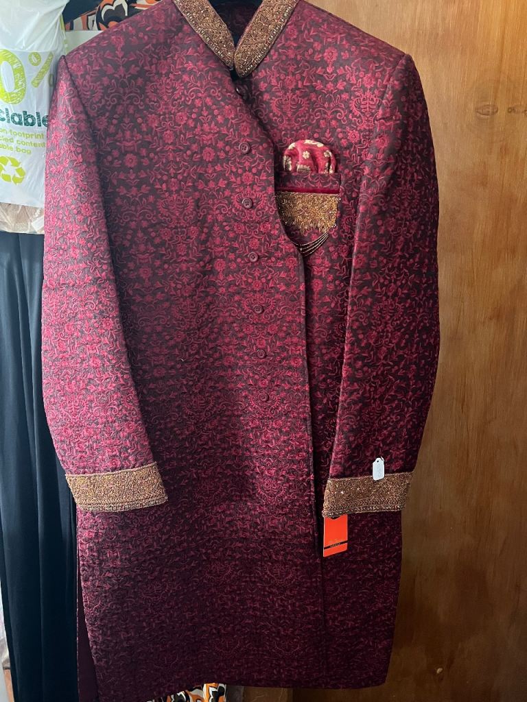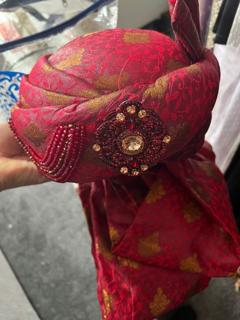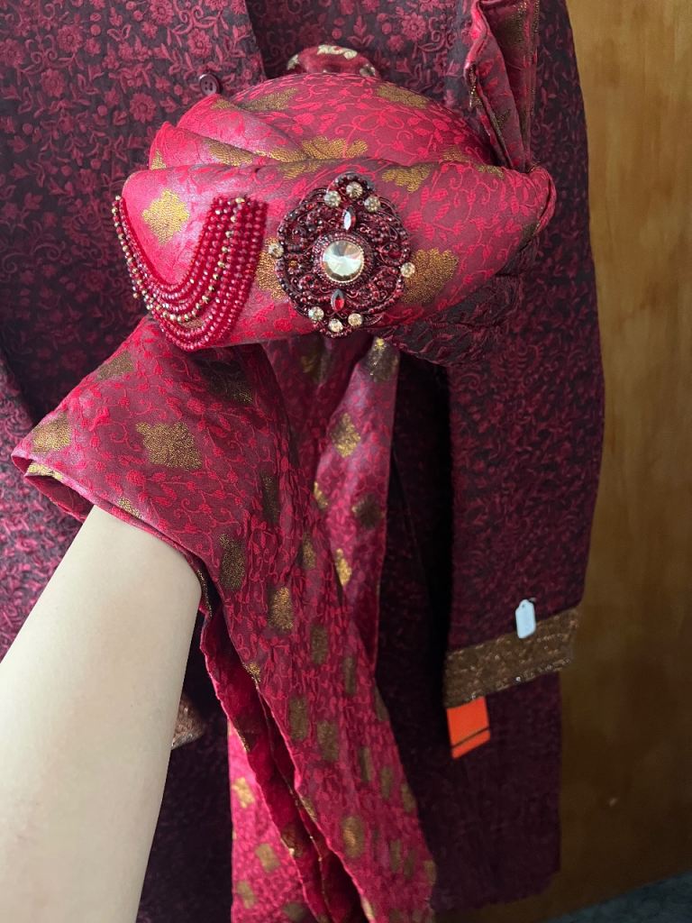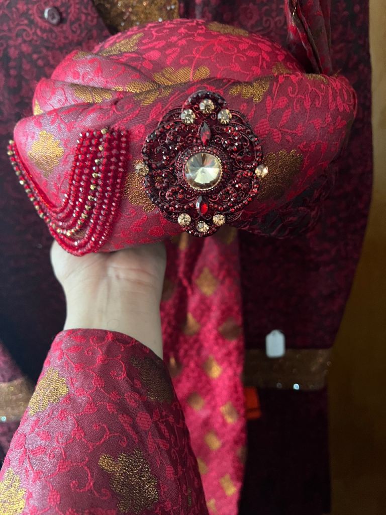 Comes with sharwani suit, underneath top and trousers, hat with a scarf attached and shoes