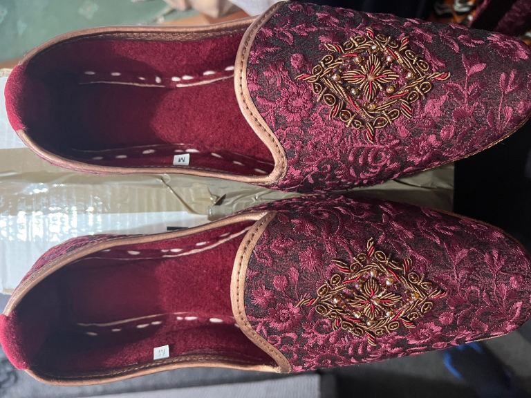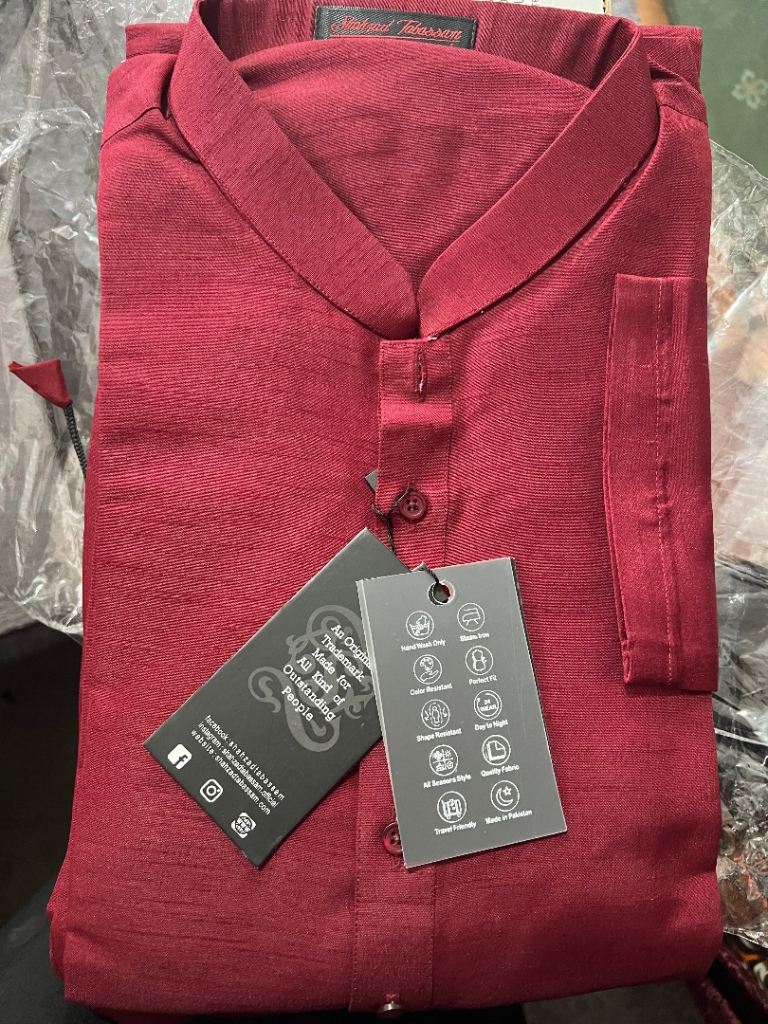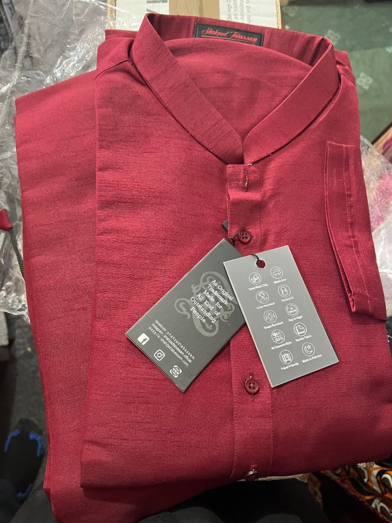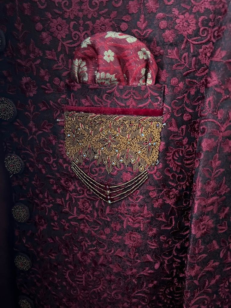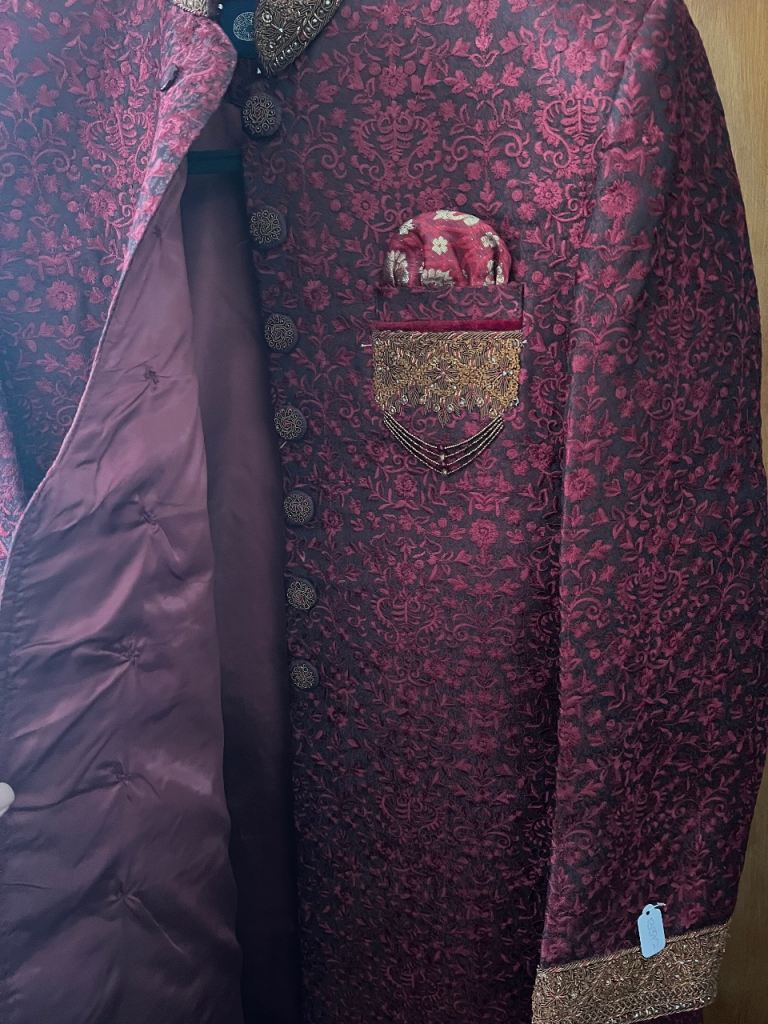 Comes with sharwani suit, underneath top and trousers, hat with a scarf attached and shoes
