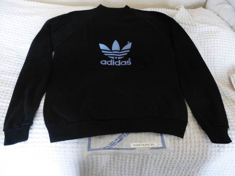 An acrylic XL mens black sweatshirt from the late 1980s or early 1990s. This has never been worn. There is a slight blemish on the front of the shirt just below the word adidas matching the colour of the motif, which looks like a manufactoring issue (can be seen on second photograph).