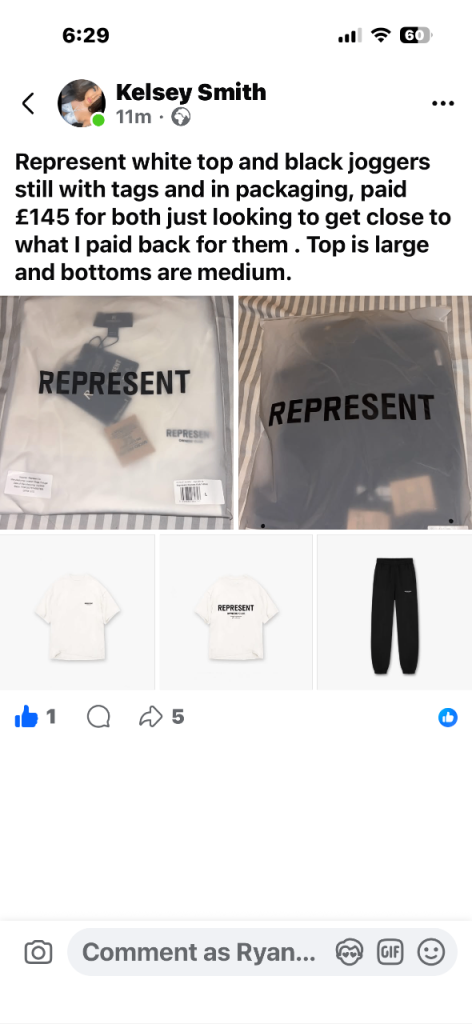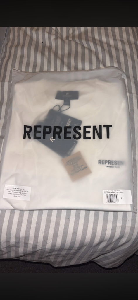 Represent white top and black joggers still with tags and in packaging, paid £145 for both just looking to get close to what I paid back for them. Top is large and bottoms are medium.