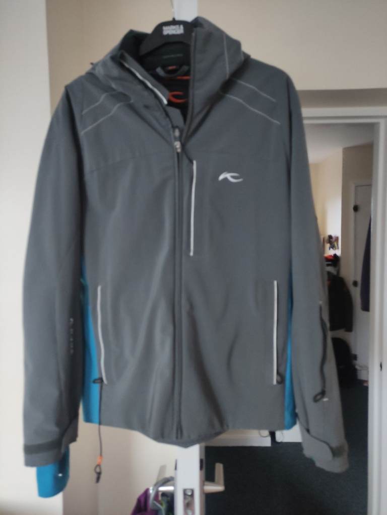 I have a nearly new male KJUS ski jacket in dark grey, size 48/S, with a detachable hood and all the ski features - long neck warmer, zipped sleeve pocket, adjustable waist, inner and outer breast pockets, adjustable Velcro sleeve ends and extended inner hand warmer.