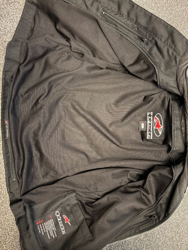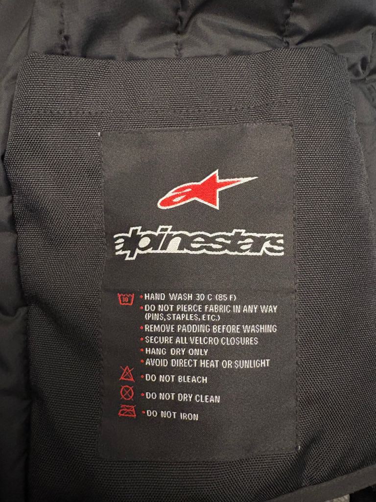 Features internal mesh lining and visible Alpinestars branding on the sleeves and care label.