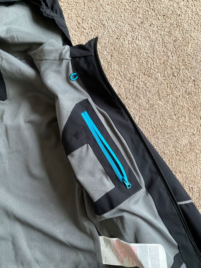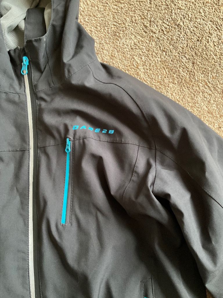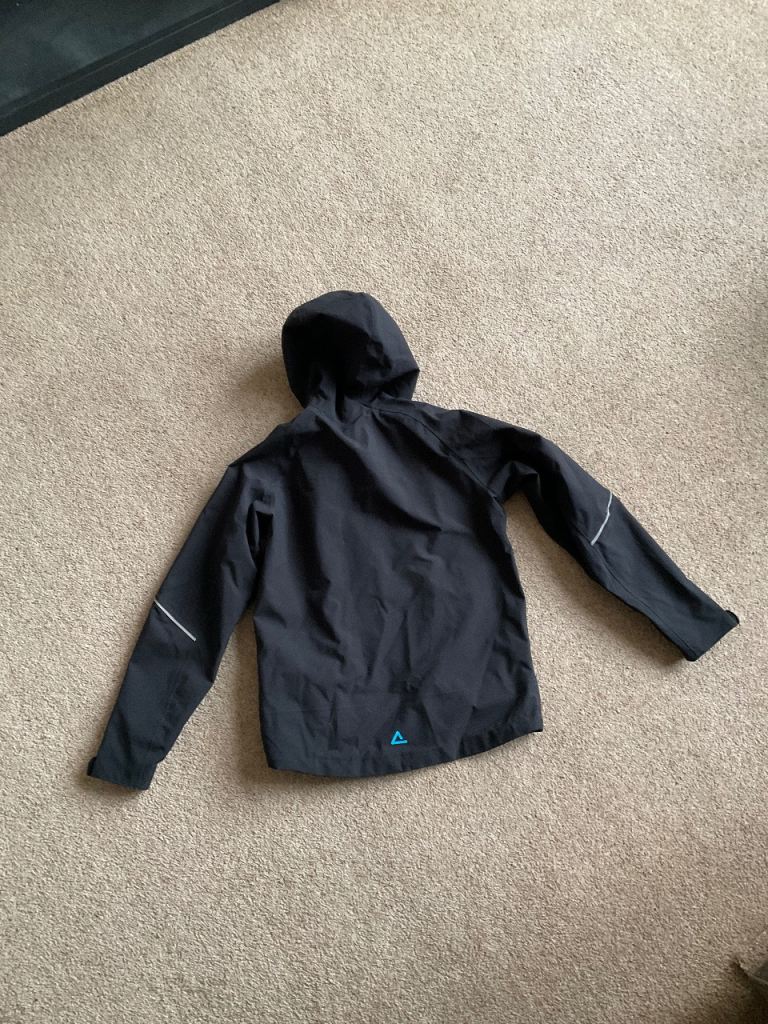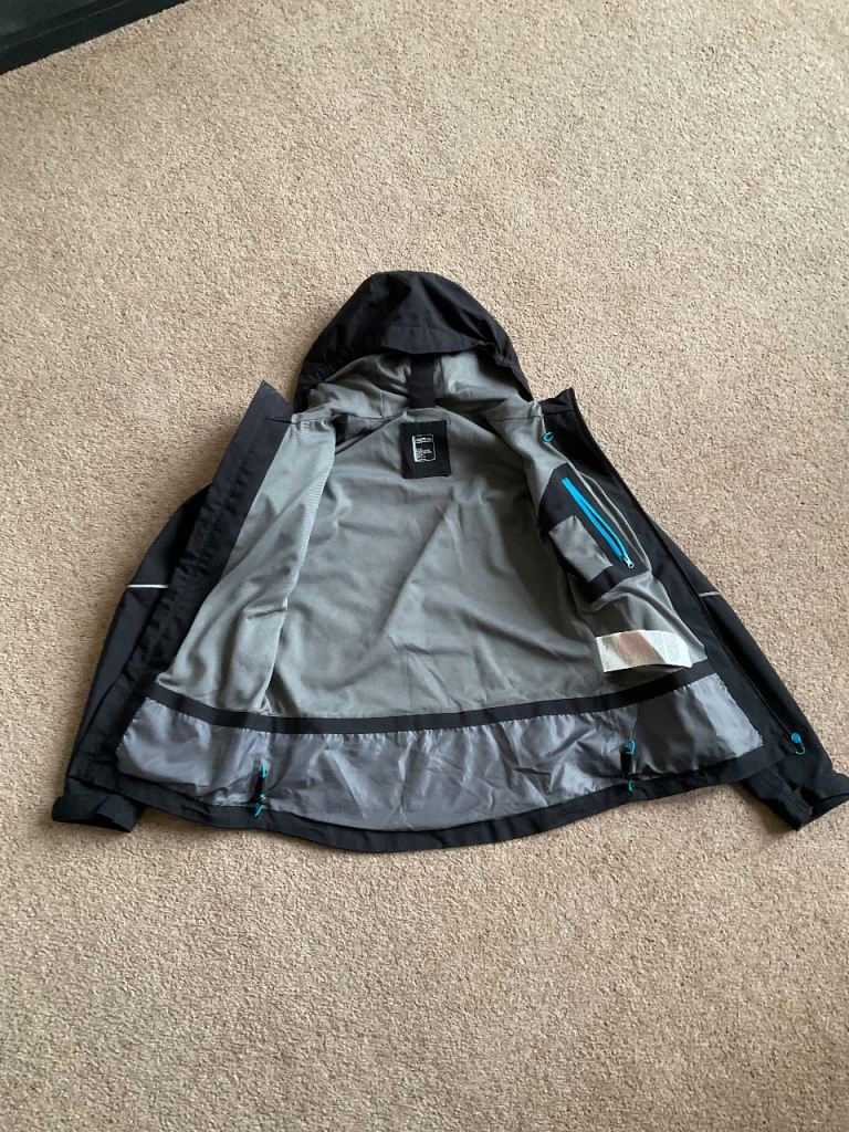 Black lightweight Dare2B jacket. With blue detail on zips. Has fluorescent strips on front and arms. Suitable 11-12. Ideal Spring jacket.