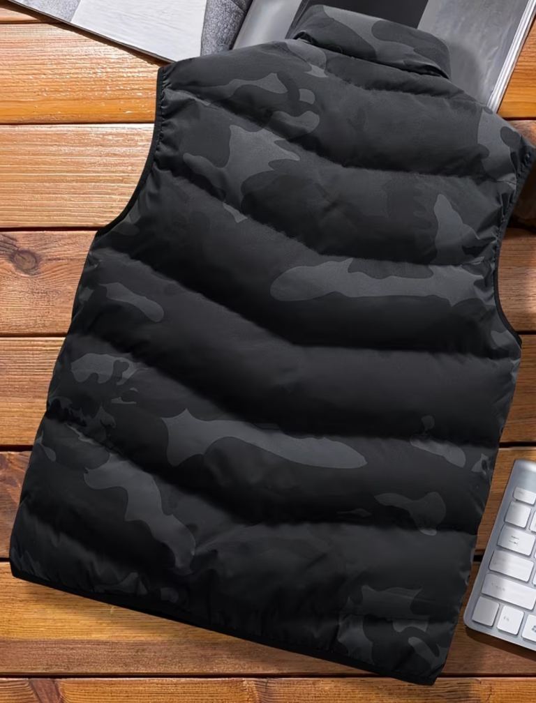 It's a black gilet with a subtle camouflage pattern, great for layering.