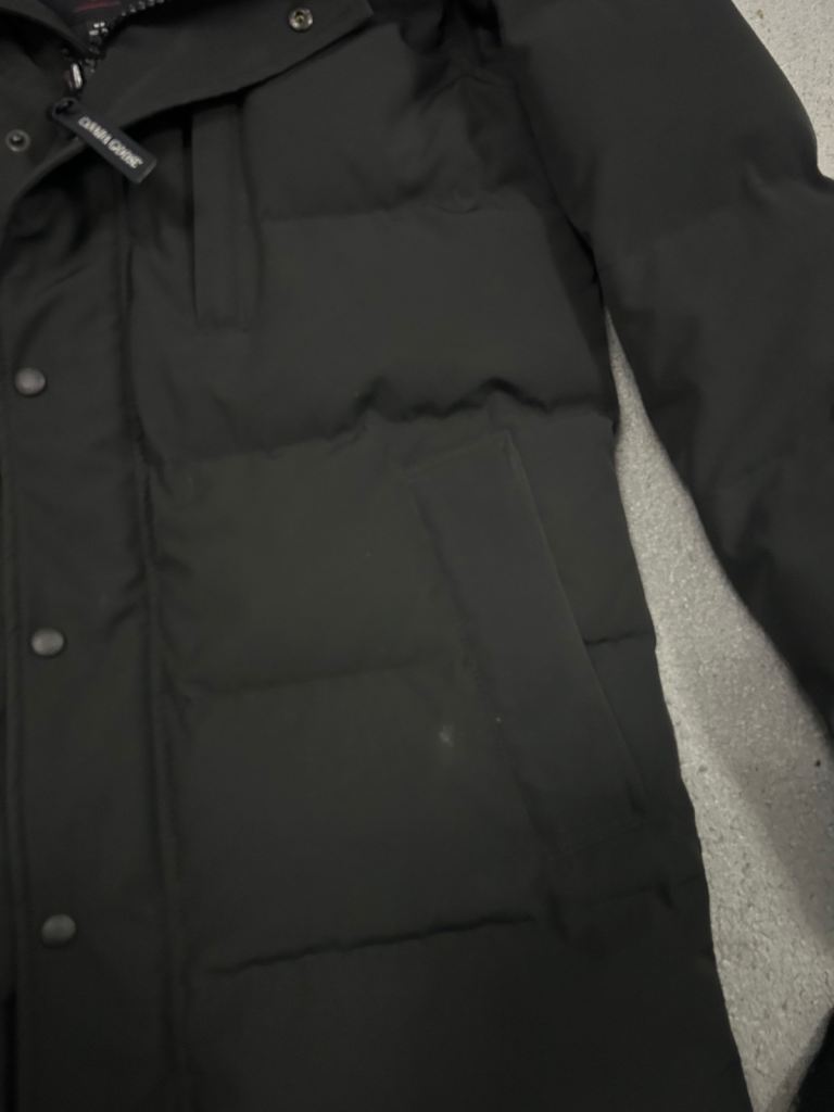 The parka features Canada Goose's renowned craftsmanship, premium insulation, and a detachable fur-trim hood, making it ideal for cold-weather wear while maintaining a sleek, modern look. I do not have detachable fur trim as I have lost it. Has a tiny small white spot on jacket which can be removed with a small wash or even a wipe.