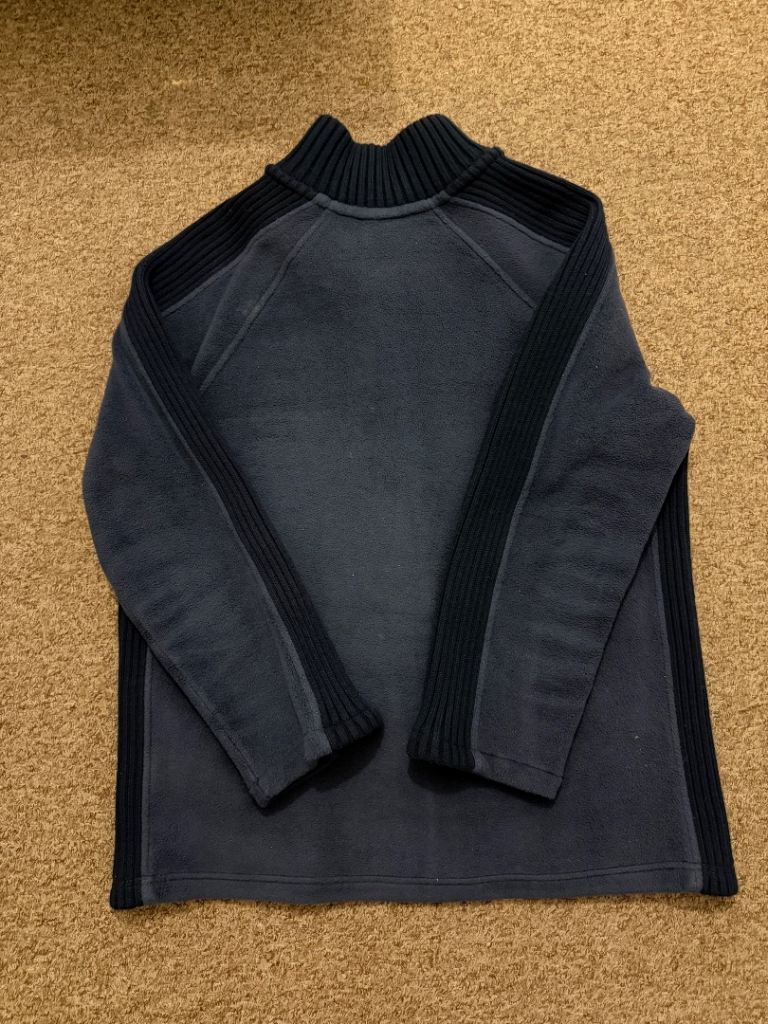 dark blue fleece jacket with full zipper and ribbed side panels