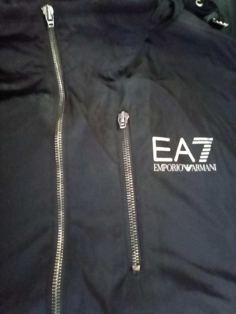 EA7 Emporio Armani Mens Folded Hooded Jacket, colour black with white, silver zips and badge its a size xl and has a tiny mark on top right neck. Sell it for £75
