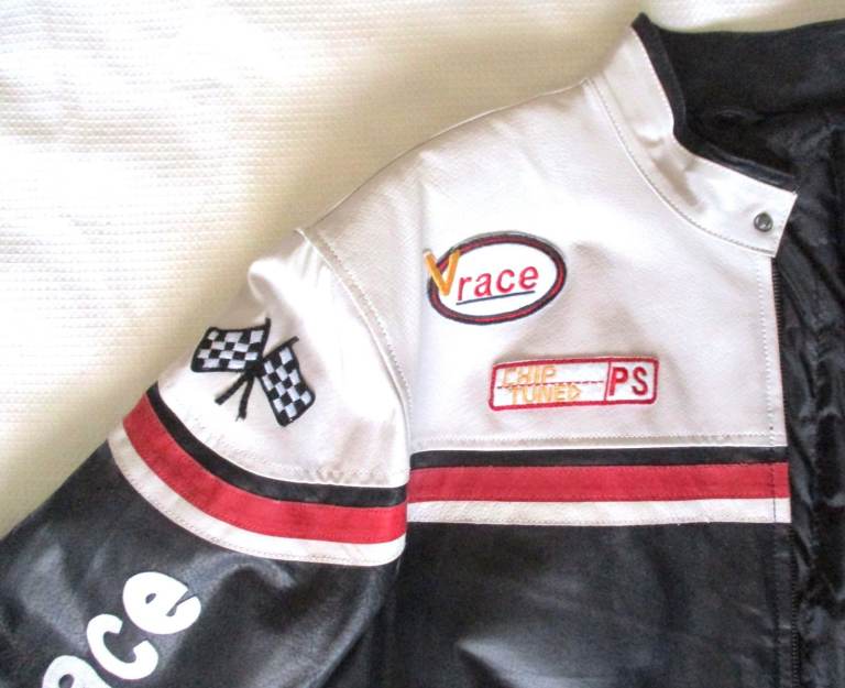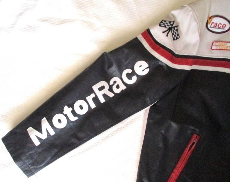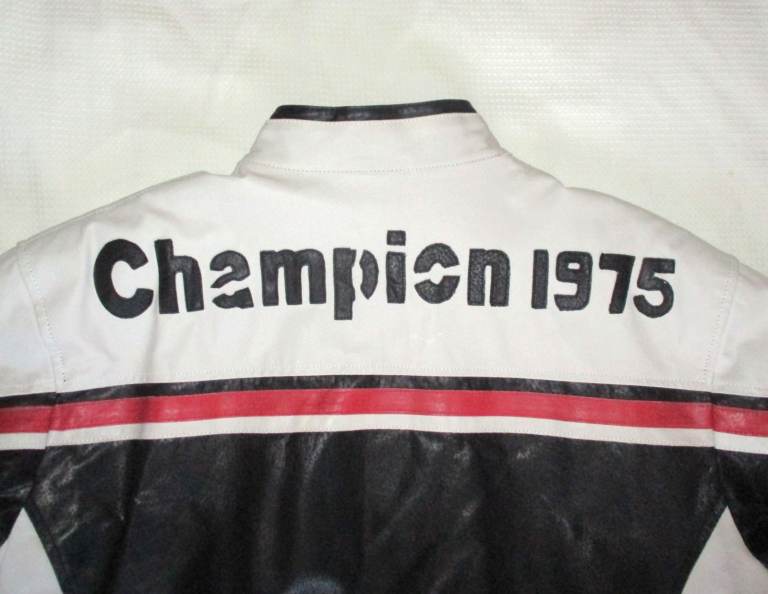 MotorRace sewn on right sleeve, HighSpeed on left sleeve, Champion 1975 on the back, and various other embroidered patches as photographed