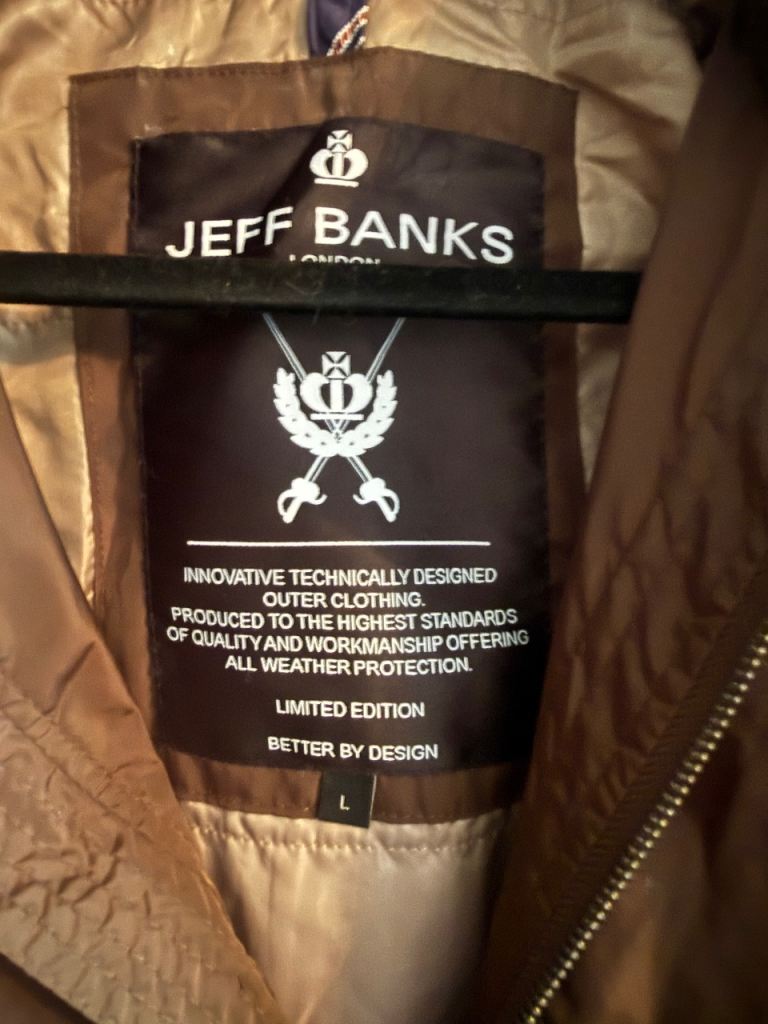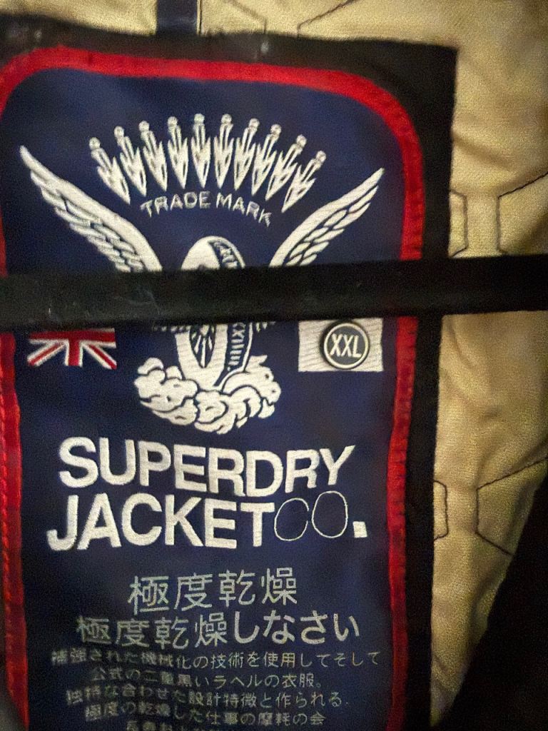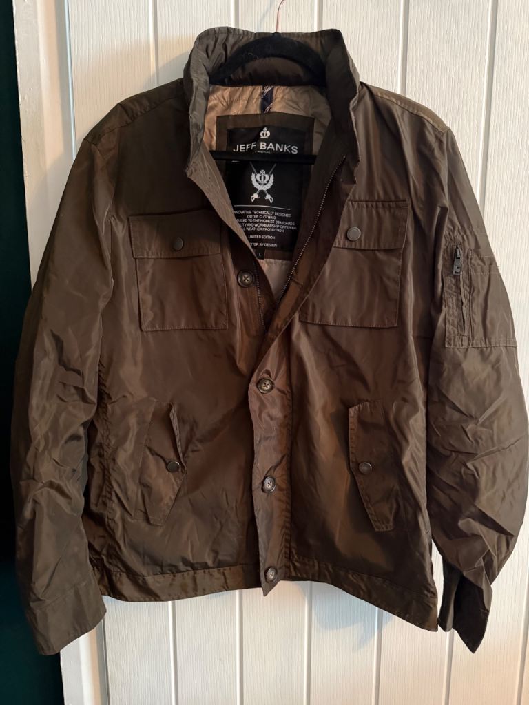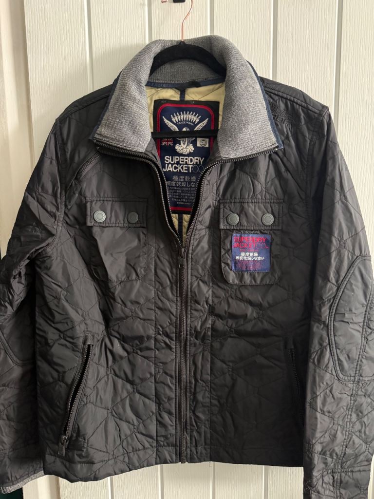 The Nike jacket is size L in dark green, the Superdry is XXL in black, and the Jeff Banks is L in brown.