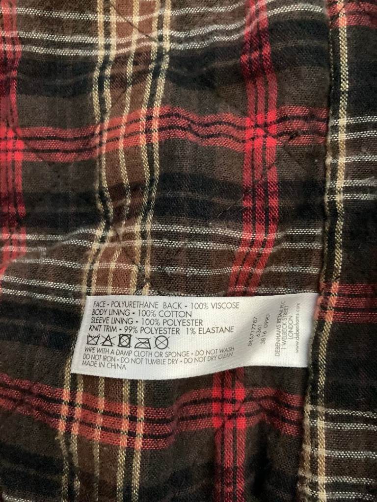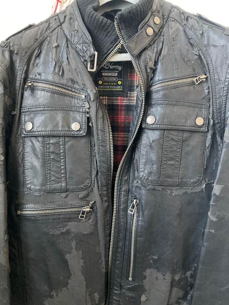 The jacket has the polyurethane exterior flaking and peeling off due to heat and moisture, giving it a distressed and used look