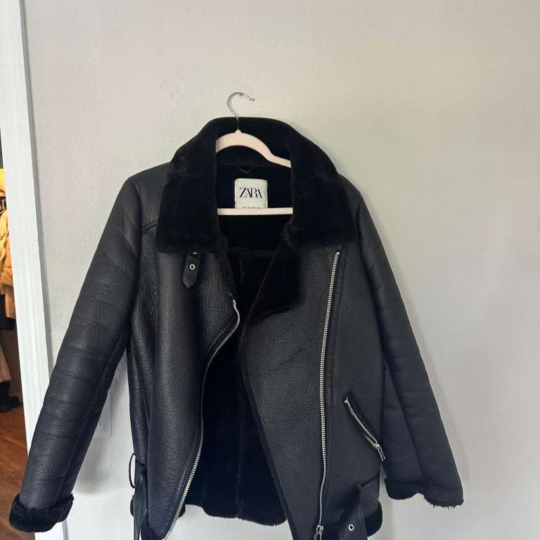 Stylish black leather jacket. Features zip closure and belted waist. Soft inner lining for comfort.