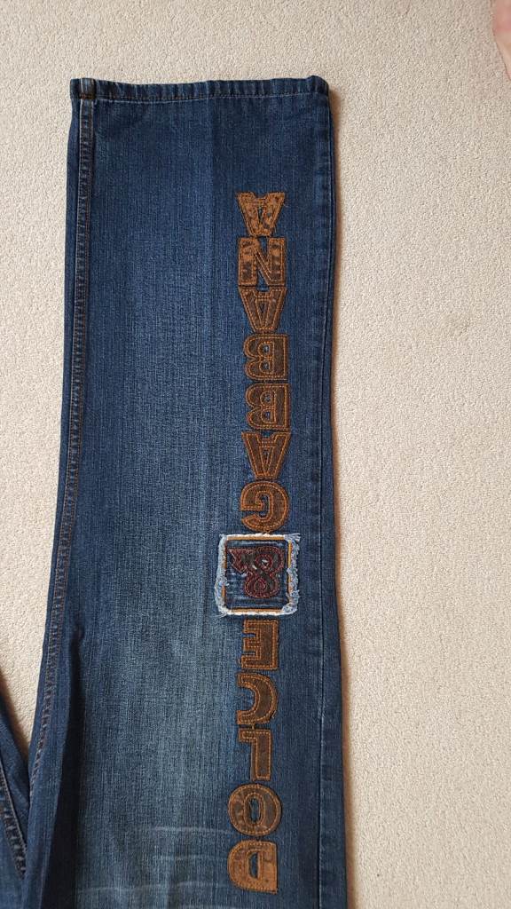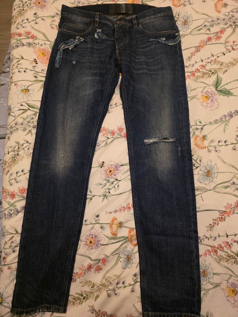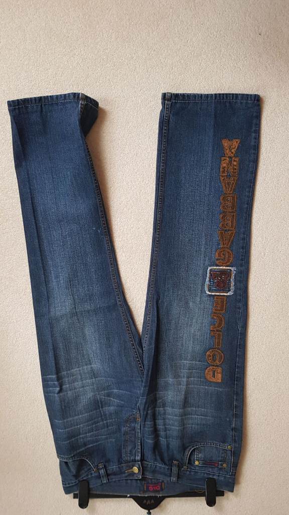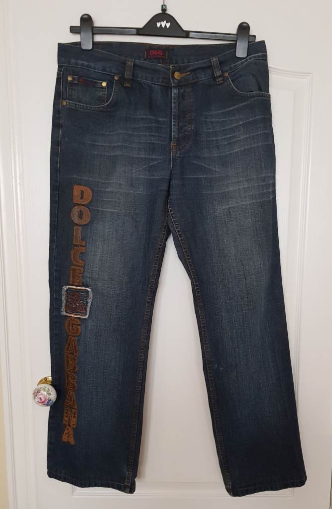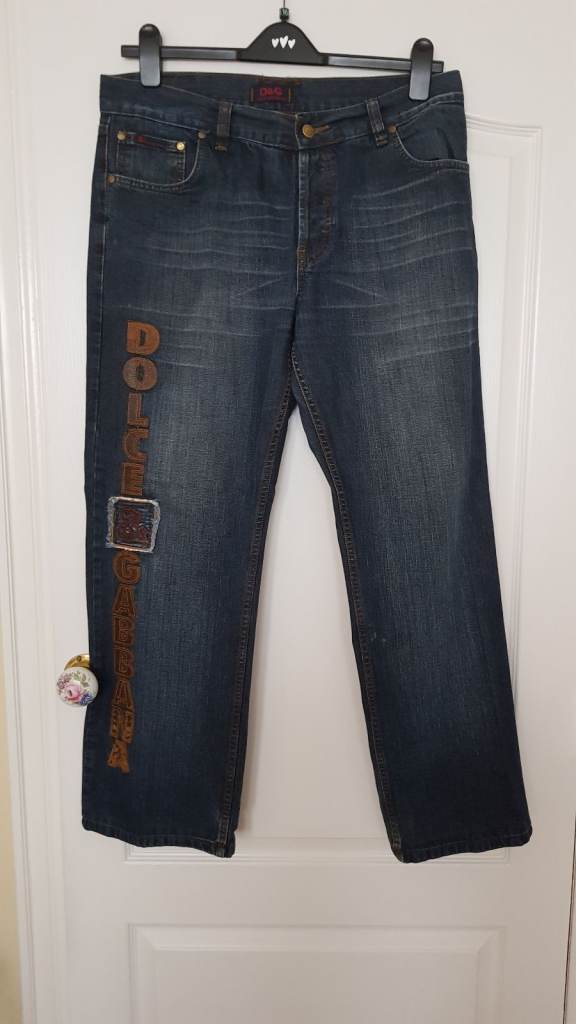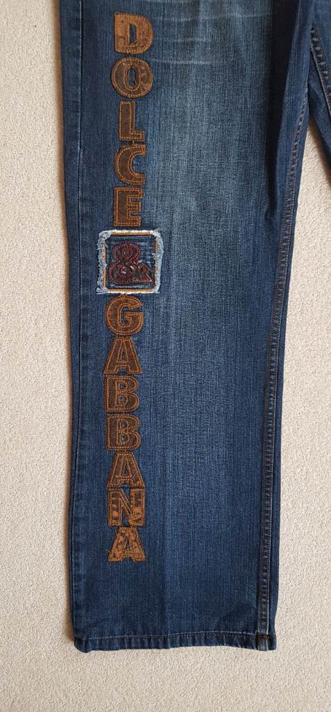 Good pair of jeans in great condition and good quality but not genuine D&G. Button fastening, all buttons embossed 'Dolce & Gabbana' and 'D&G' belt loop. 'Dolce & Gabbana' down right leg in faux leather. Waist across front when laid flat 18 inches, inside leg 30 inches